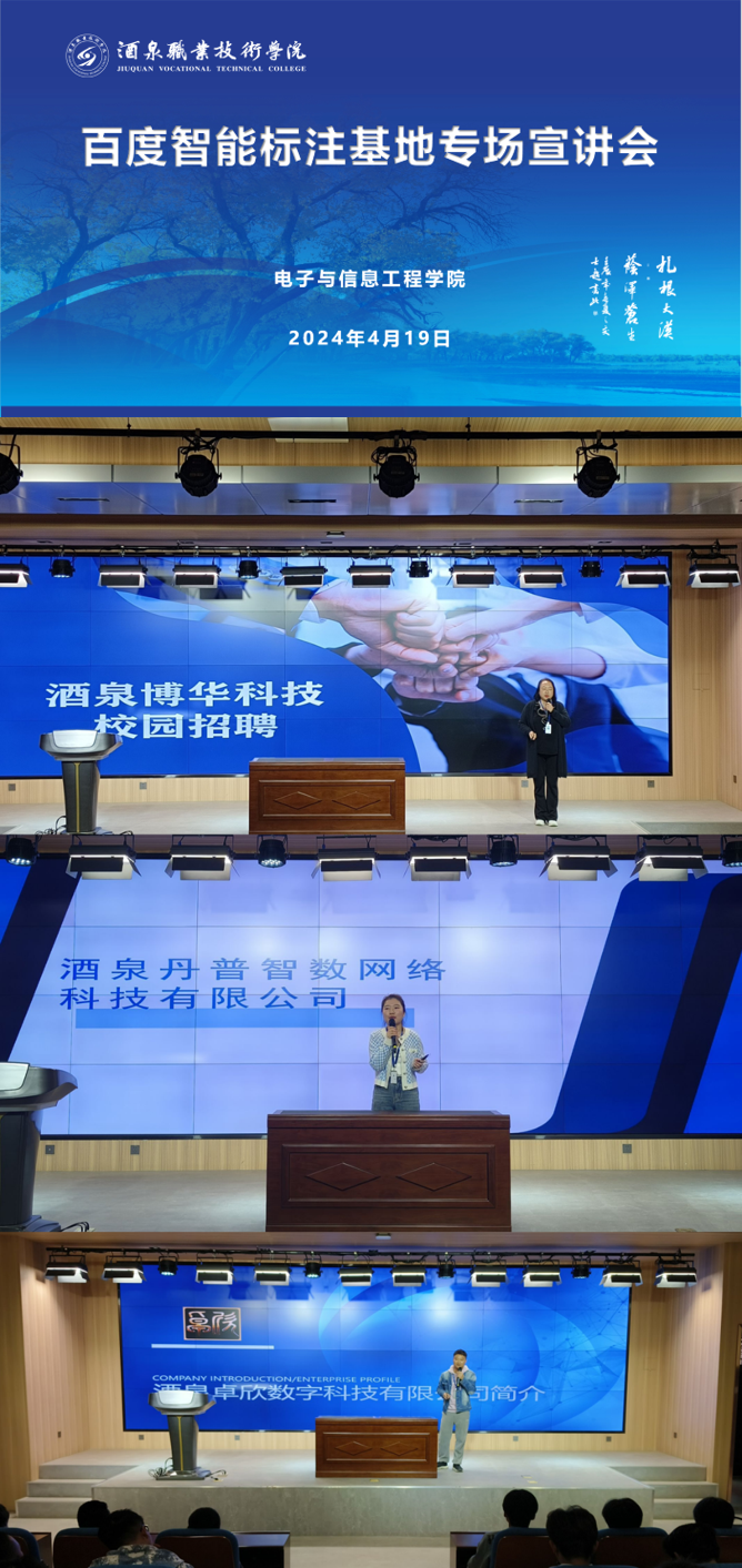 宣讲会由酒泉博华数字科技有限公司、酒泉卓欣数字科技有限公司、酒泉丹普数字科技有限公司三家数据标注服务商逐次主讲,一方面向实习学生讲述各自企业文化、管理要求、工作内容、薪资待遇,企业福利等内容,另一方面针对前期学生提出的问题做出解答。