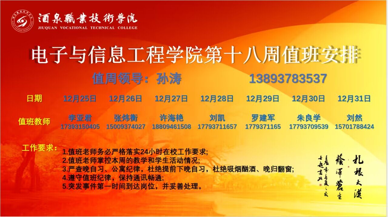 第十八周值班安排(12.25-12.31)