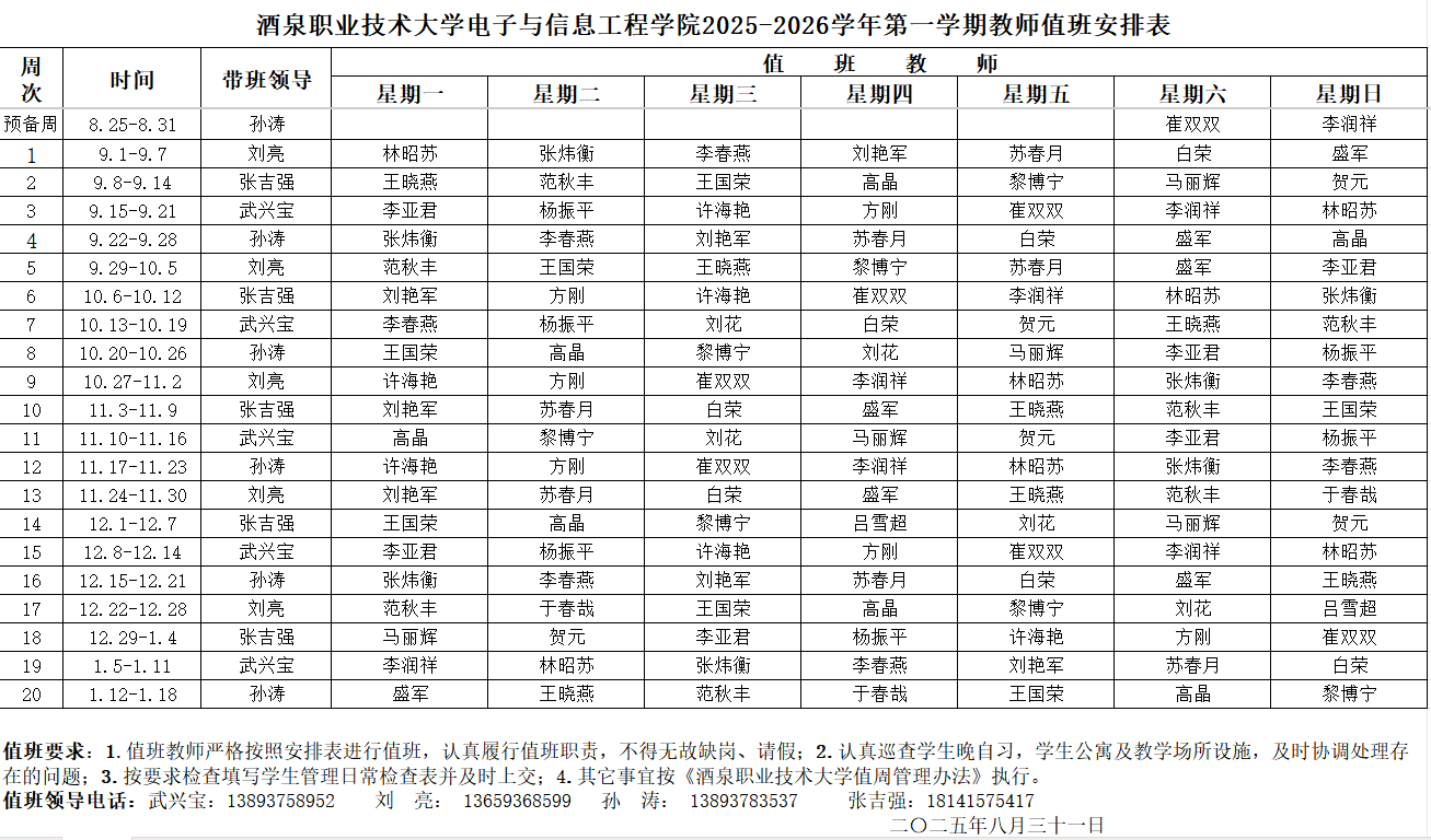 电子与信息工程学院2025-2026学年第一学期教师值班安排表