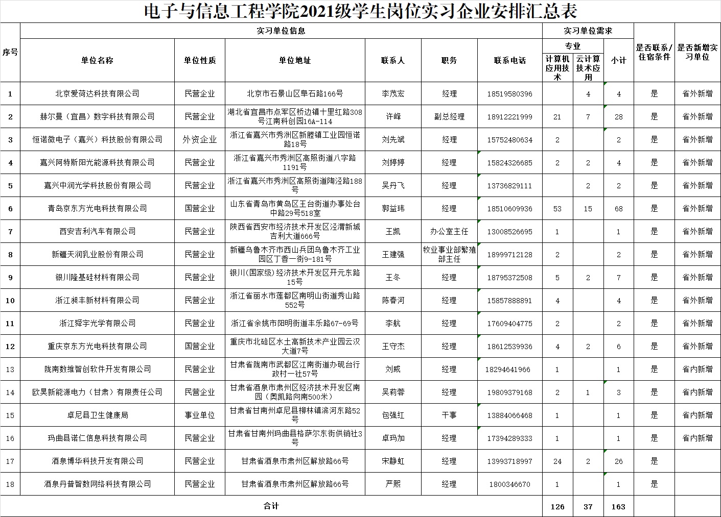 根据《教育部等八部门关于印发〈职业学校学生实习管理规定〉的通知》(教职成〔2021〕4号)和《甘肃省职业学校学生实习管理实施细则》(甘教职成〔2022〕2号)文件精神。经学校党委会议审议通过,电子与信息工程学院2021级学生安排到18家单位实习,18家实习单位均符合《职业学校学生实习管理规定》相关要求。现予以公示,接受社会监督。