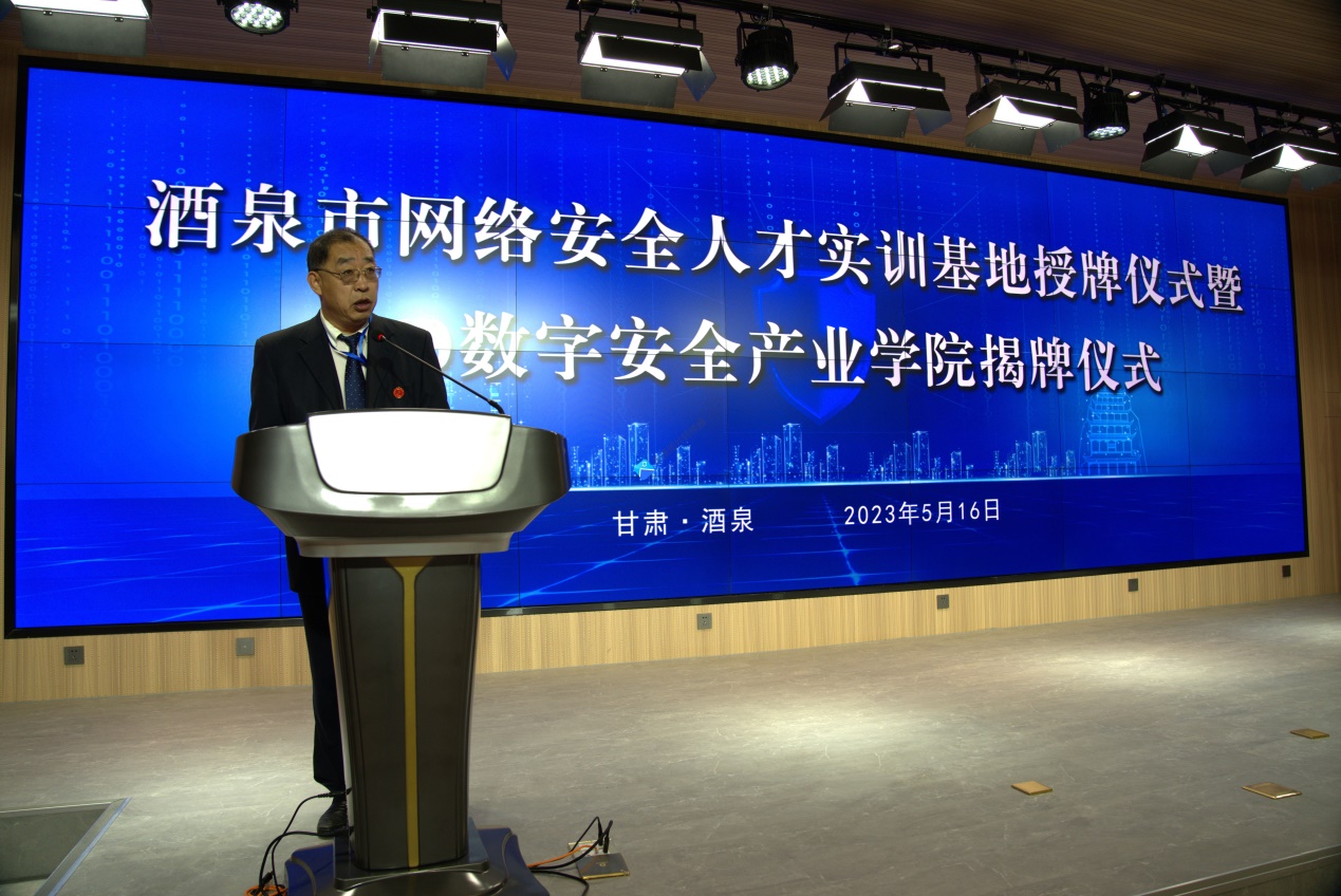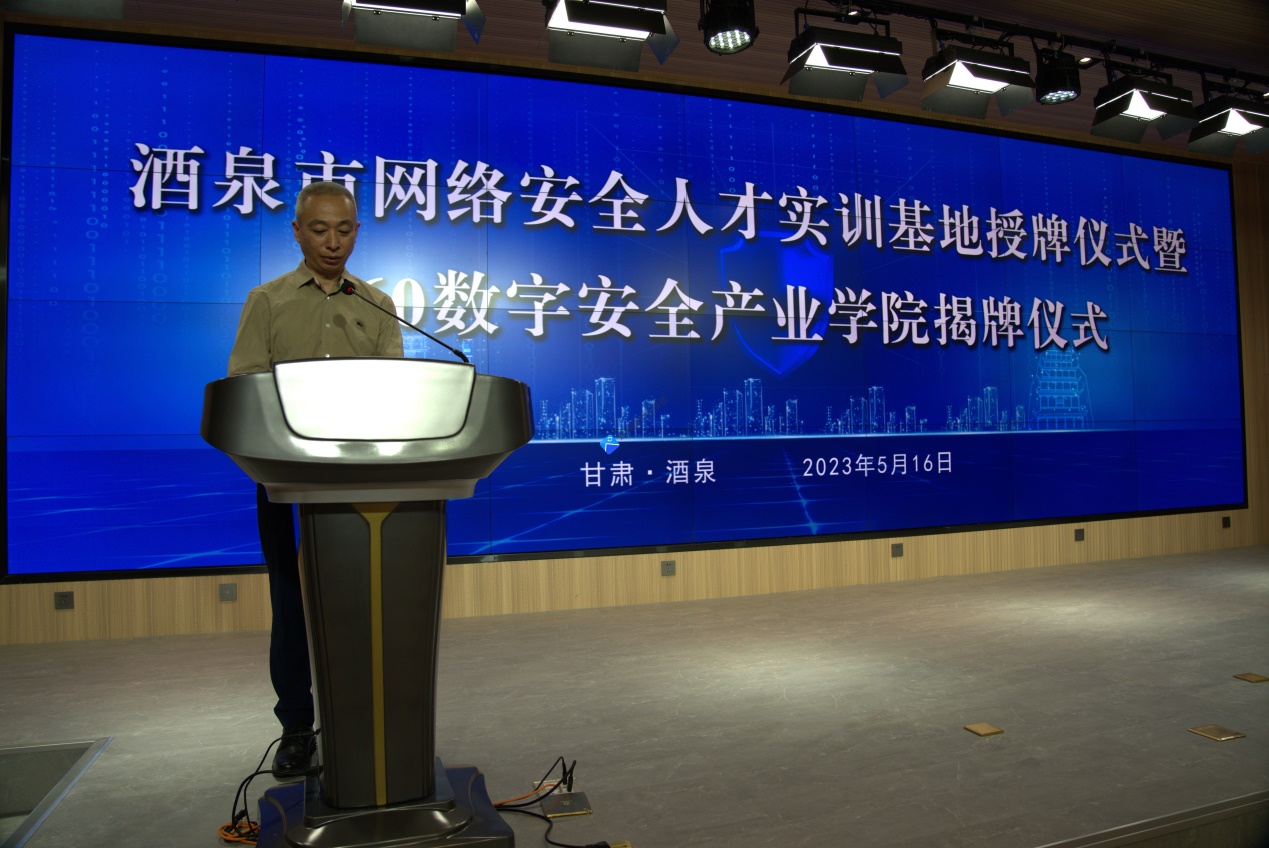活动首先由酒泉职业技术学院党委副书记许军致辞,他代表全校师生向前来参加揭牌仪式的各位领导和朋友,致以诚挚的谢意和热烈的欢迎!对一直以来关心支持学校发展的市委市政府各级领导、360数字安全集团的各位朋友,表示衷心的感谢!对学校近年来的建设进行了简要介绍,表示酒泉市网络安全人才实训基地和360数字安全产业学院落地酒泉职业技术学院,是学校和360数字安全集团在深化产教融合、推进校企合作方面的又一重大实践。实训基地和产业学院的建成,将对推进数字安全行业人才培养、技术服务、社会培训和服务数字安全行业和区域经济社会发展起到积极地助推作用,将对创新校企合作模式、拓展产教融合内容做出更加有宜的探索。期盼校企双方能以今天的挂牌仪式为新的合作起点,通过共建、共研、共管、共享,进一步完善企业深度参与协同育人机制,将实训基地和产业学院建设成为集人才培养、创新孵化、技术服务、社会培训于一体的特色办学实体,将其打造成为数字安全领域技术技能人才的培养高地和创新服务平台。