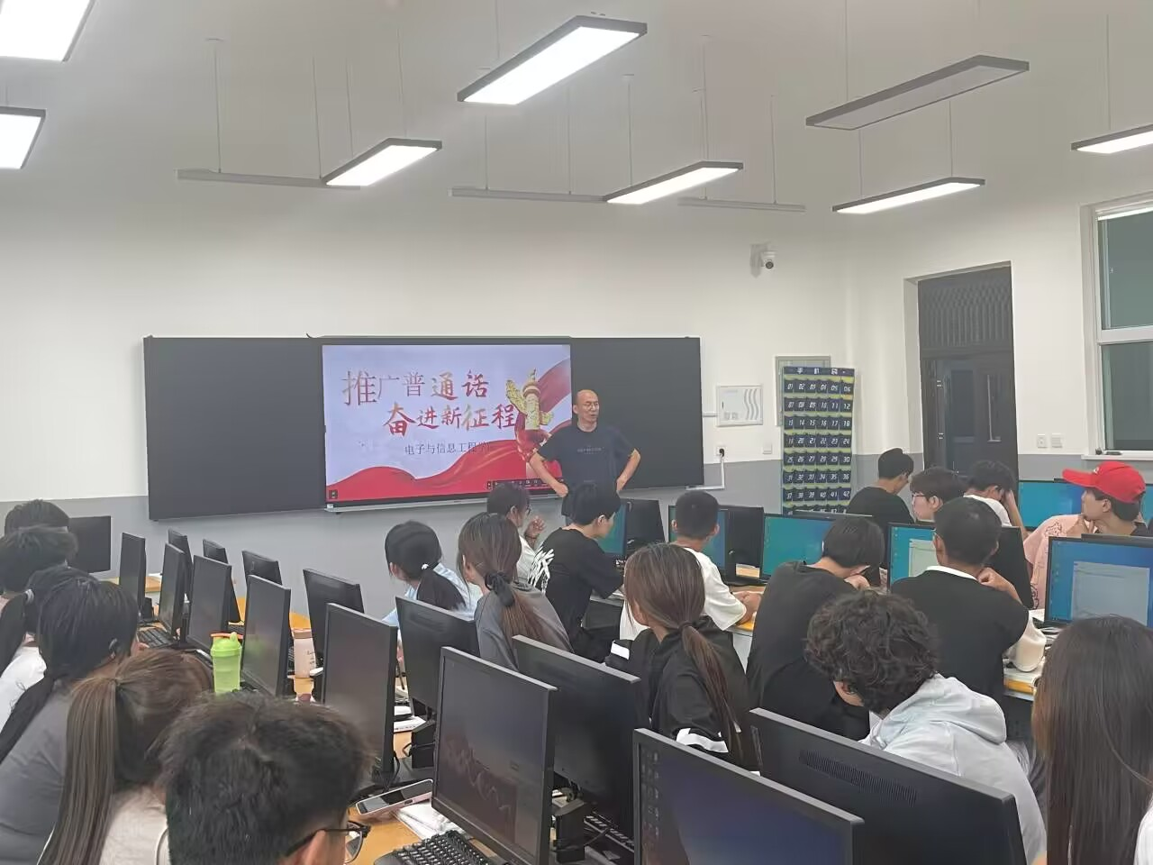 活动期间电子与信息工程学院组织各班级班主任讲解普通话的意义,并采用互动方式就普通话常见的发音问题进行了正确示范,告诉他们什么是普通话、为什么要推广普通话、怎么说好普通话,引导学生树立正确的语言观,使学生在日常生活中养成说普通话的习惯。