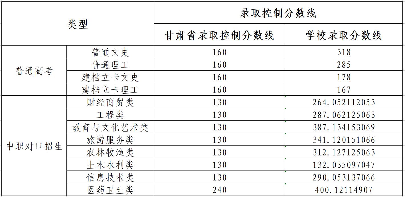 酒泉职业技术学院2022年甘肃省招生录取控制分数线