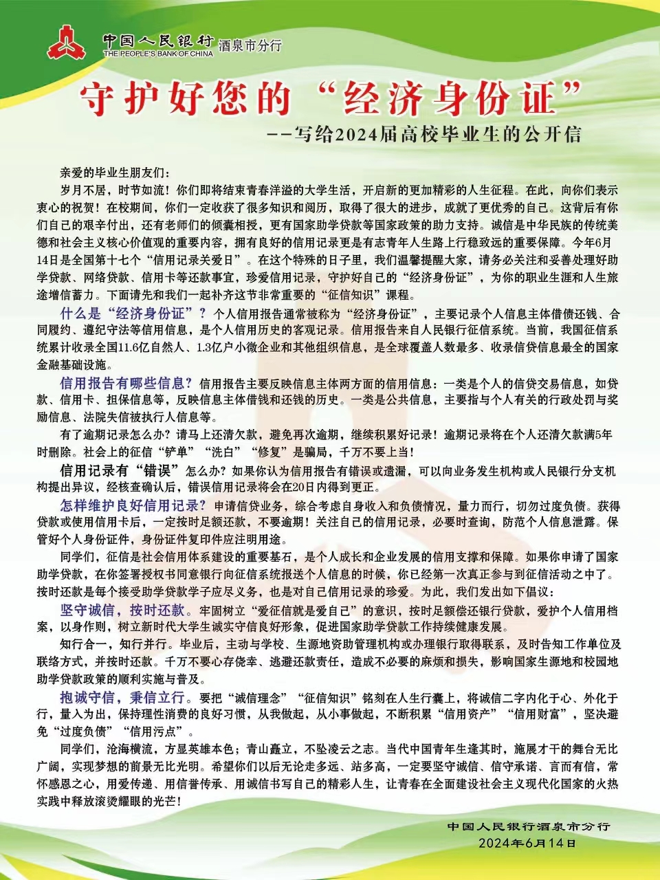 在“6·14信用记录关爱日来临之际,我们向全体大学生发出倡议: