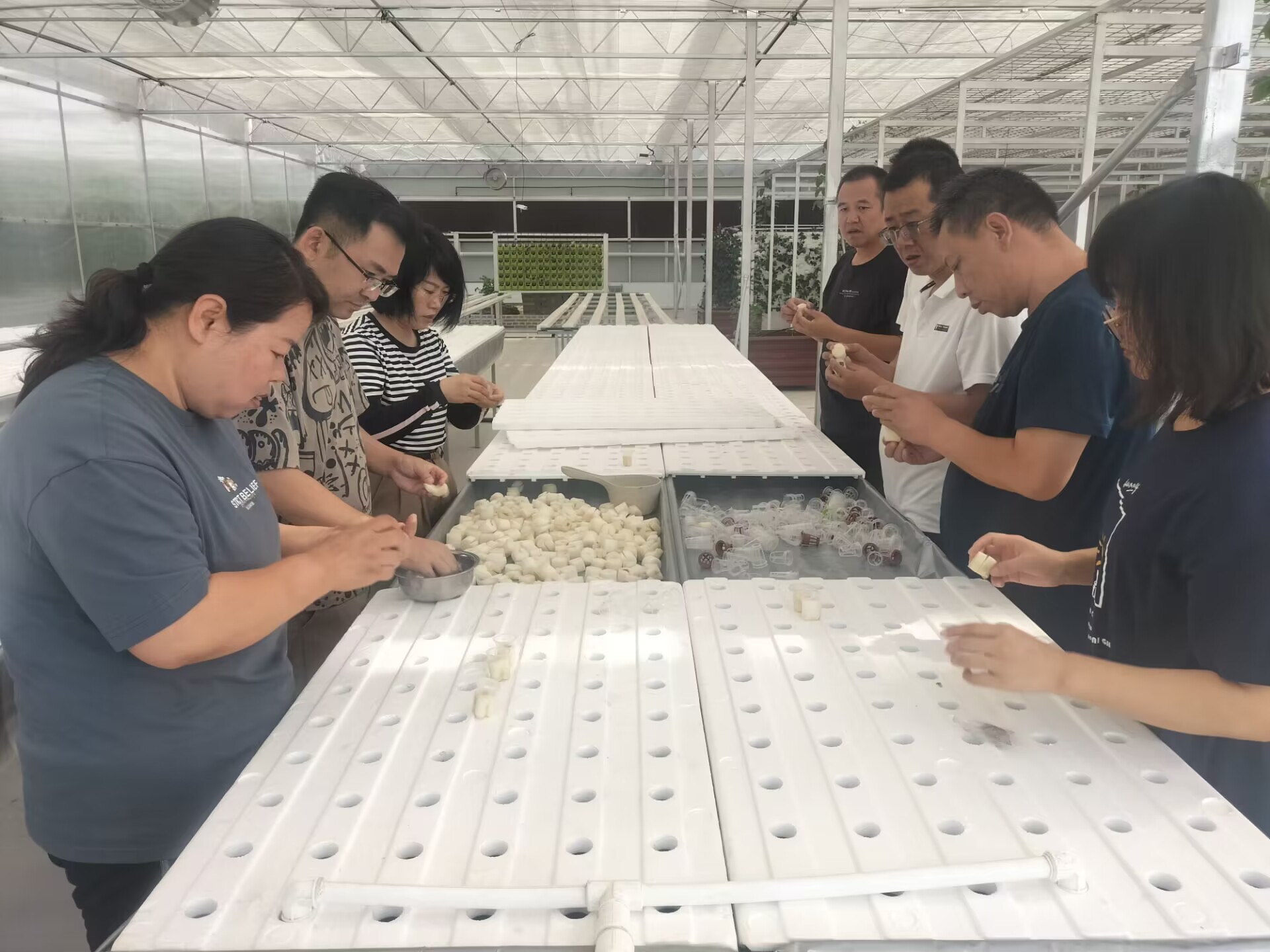 活动主要包括生菜育苗和西红柿种植园的清理;全体人员参与基质混配、填装、穴盘播种、浇水等育苗工作和西红柿种植园的清理。