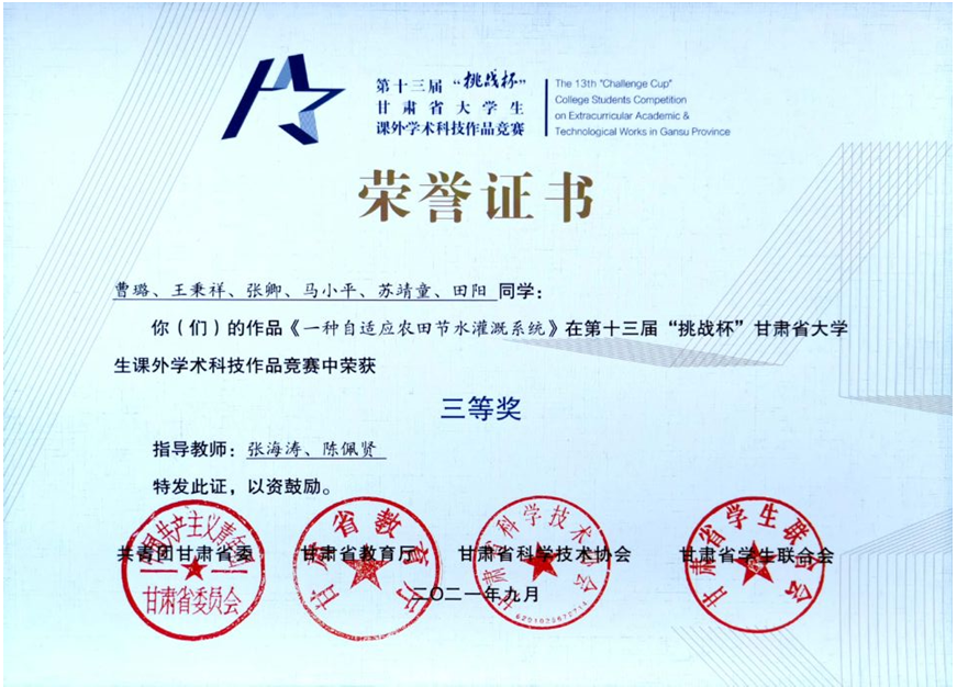 第三十届挑战杯甘肃省大学生课外学术作品竞赛获奖作品--一种自适应农田节水灌溉系统