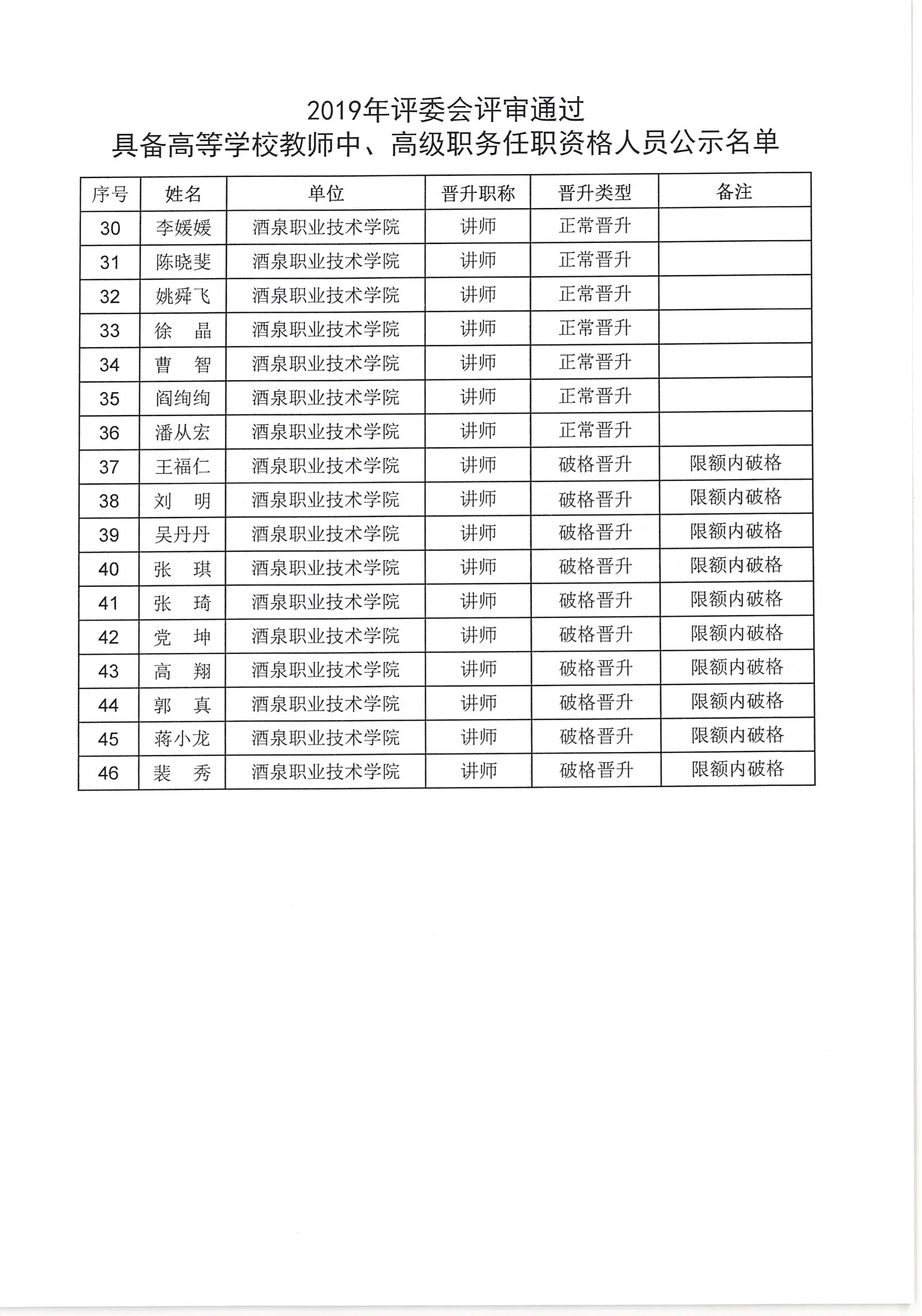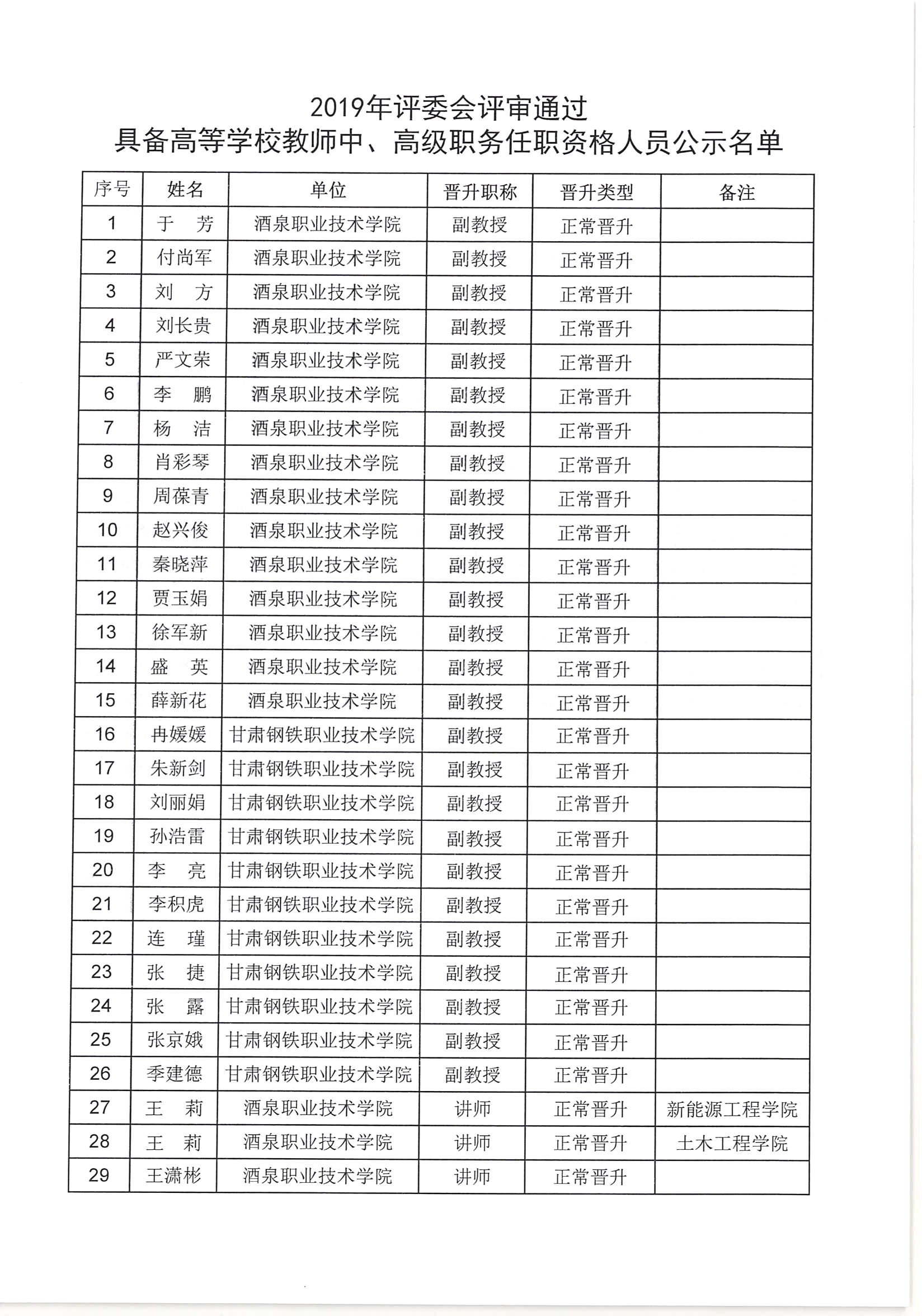 2019年酒泉职业技术学院高等学校教师高级职务任职资格评审会通过人员名单公示