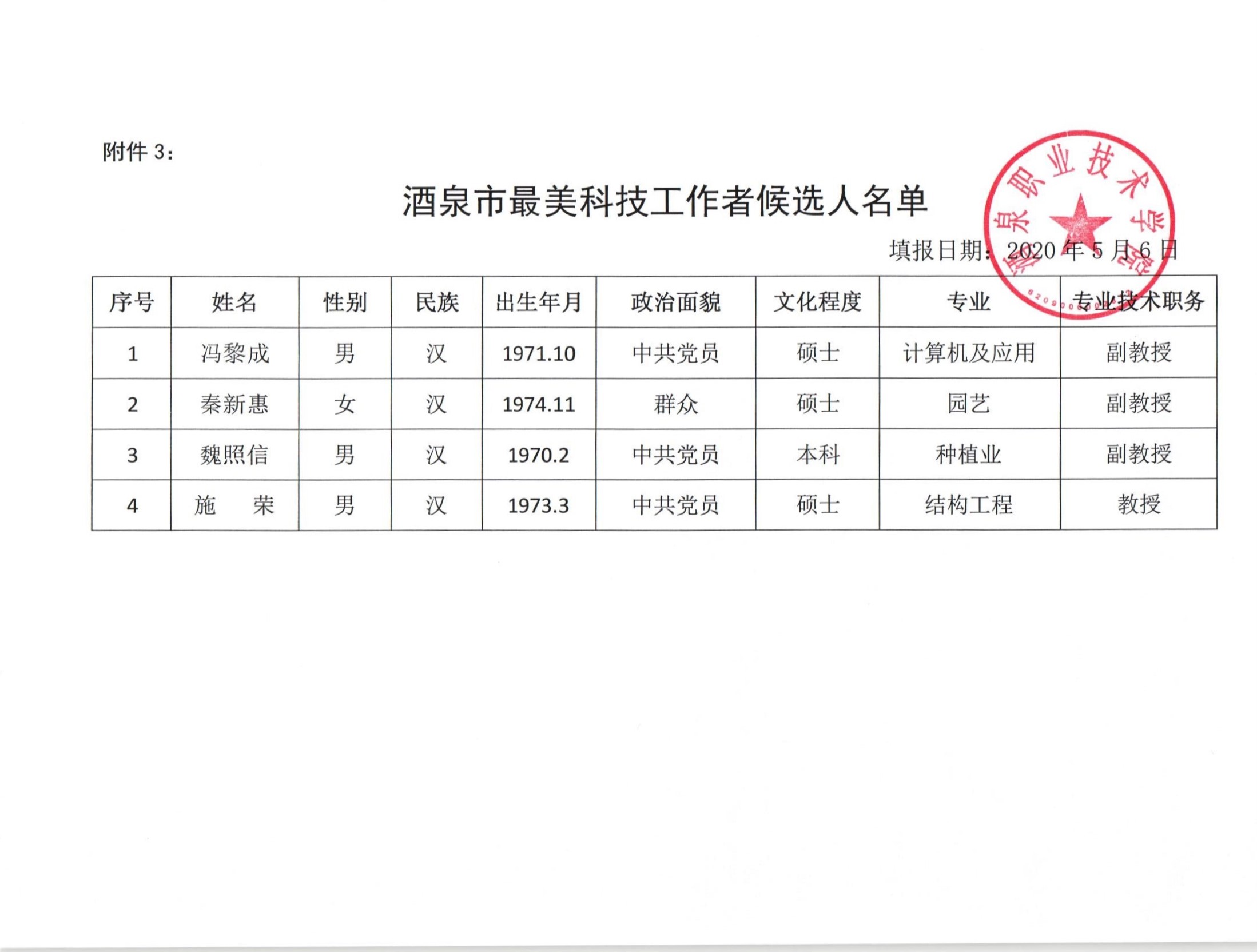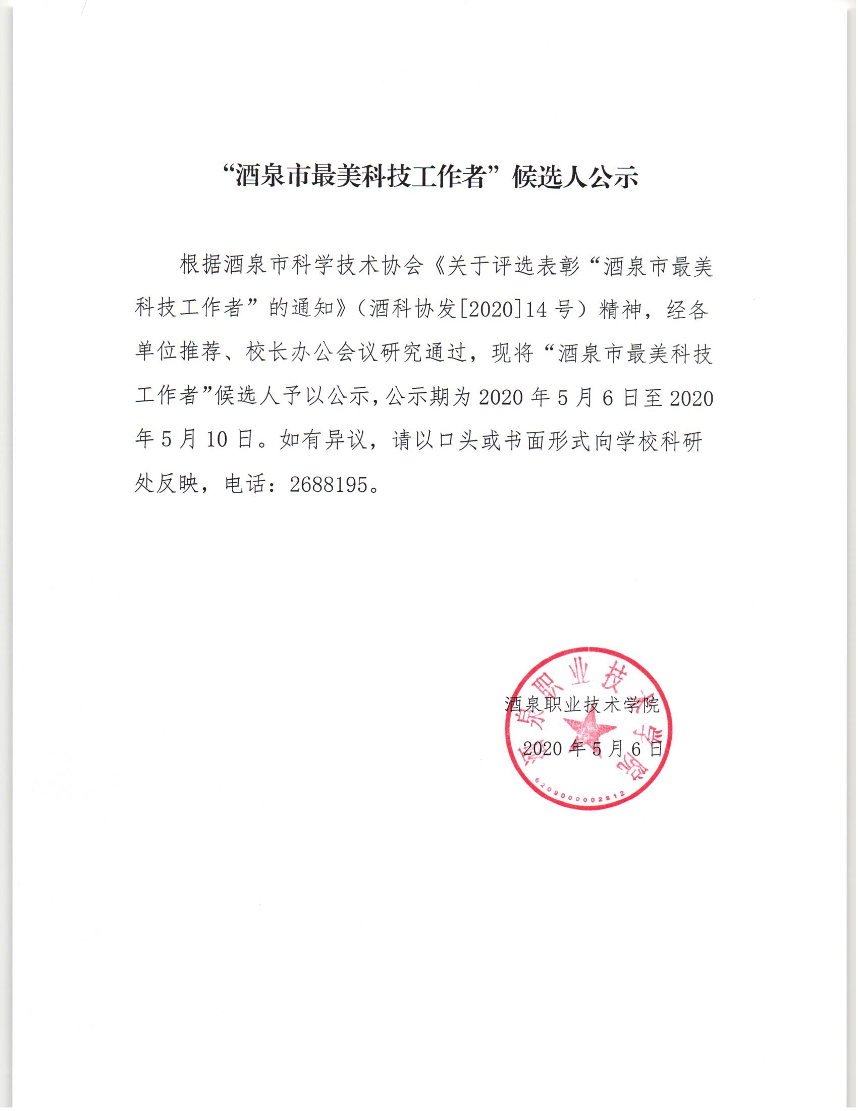 通知公告 > 正文酒泉市最美科技工作者候选人公示