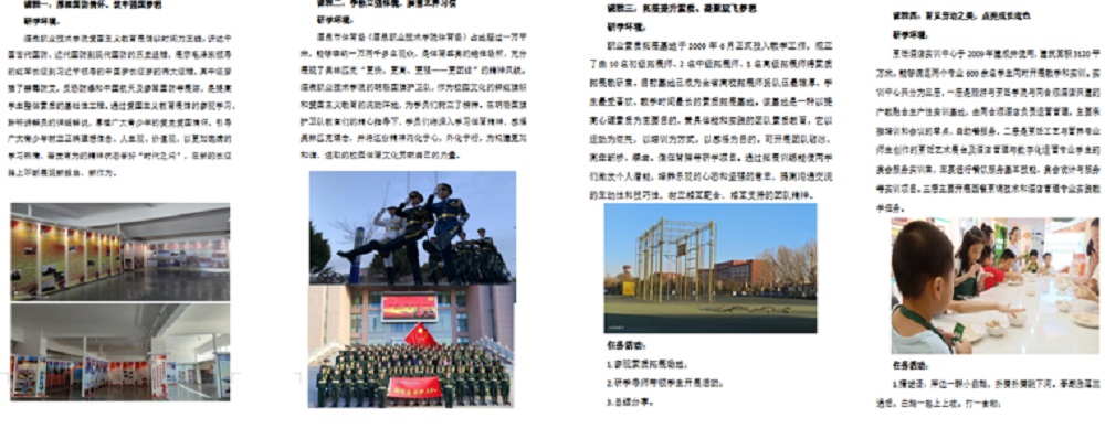 深入挖潜,解锁校园研学新路线。教学中专业老师推进“课堂革命”,以校园研学项目为核心,以传习所、爱国主义教育展馆、职业素质拓展基地等学校研学资源景点为主线,以胡杨国旗护卫队的升国旗、军事科目演示,体育与健康学院的拓展活动为载体,设计红色教育体验、文化交流观光线研学路线,将红色故事、历史文化、优美景色融为一体,提升学生的研学线路设计能力。