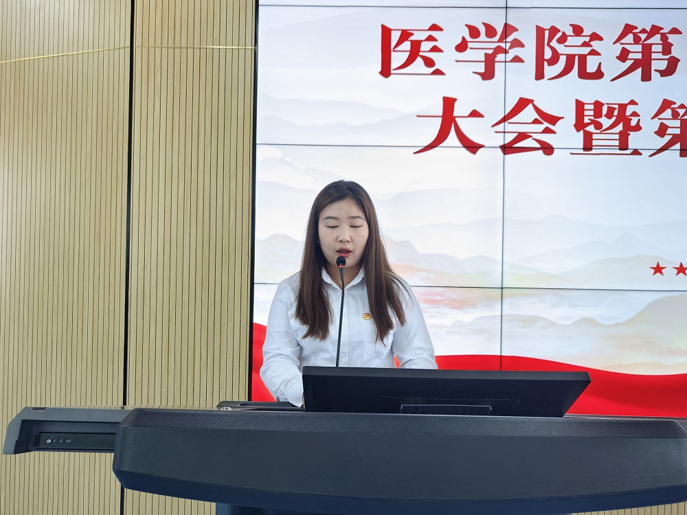 大会在庄严的国歌声中拉开序幕。首先孔繁玉老师向全院团学干部及代表们致以亲切的问候,向一直以来关心支持学院团学工作的领导及各班表示热烈的欢迎和衷心的感谢。医学院党支部书记、院长范玉敏充分肯定了上一届团学干部在各项工作中所取得的成绩,并对团学工作提出殷切期望,充分体现了学院党支部对广大学员的亲切关怀和对团学工作的高度重视。