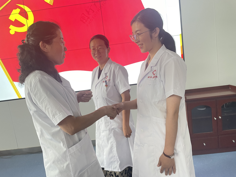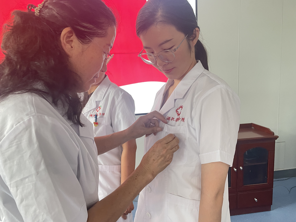 活动在庄严的《国际歌》声中拉开了帷幕,全体党员在雄浑昂扬的旋律中起立肃穆,共同体悟歌曲中所蕴含的国际共产主义精神及其奋进力量。随后,由医学院党支部副书记段国萍为甲珺杰、王佳玉两位新发展教师党员授戴党徽。