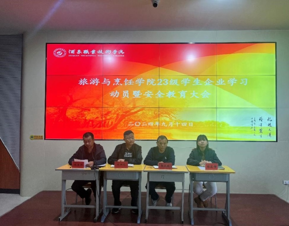 院系动态 > 正文为帮助学生进一步明确企业学习的意义及要求,推动2023级学生赴企业学习工作的顺利开展,切实提高学生实践能力,9月14日下午,我院于行知楼东阶梯教室教室召开了2023级学生企业学习动员暨安全教育大会。旅游与烹饪学院院长刘兴龙、党支部副书记张来顺、马东邦副院长、杨蕊肇副院长及学院全体教师参与了此次安全检查活动,会议由马东邦副院长主持。