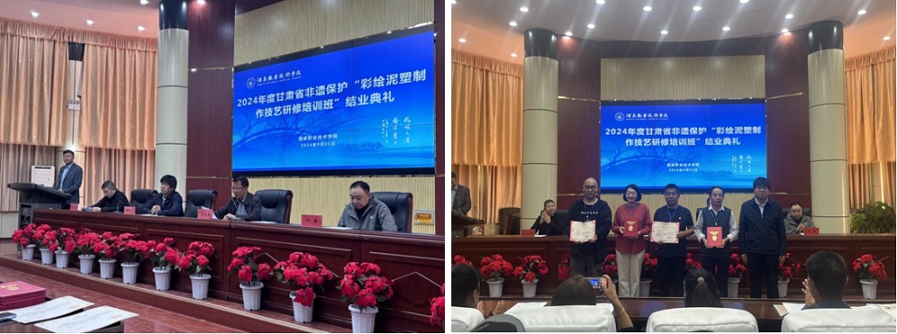 院系动态 > 正文9月25日上午,2024年甘肃省非物质文化遗产传承人研培计划-彩绘泥塑制作技艺研修培训班作品展览暨结业仪式在酒泉职业技术学院隆重举行。酒泉市文体广电和旅游局党组成员、副局长陈锦业,酒泉职业技术学院党委委员、副校长王金明,酒泉市文体广电和旅游局四级调研员纪孟祥出席展览和结业仪式,仪式由酒泉职业技术学院旅游与烹饪学院党支部书记、院长刘兴龙同志主持,研培班全体学员和旅游与烹饪学院全体教师也参加了此次活动。