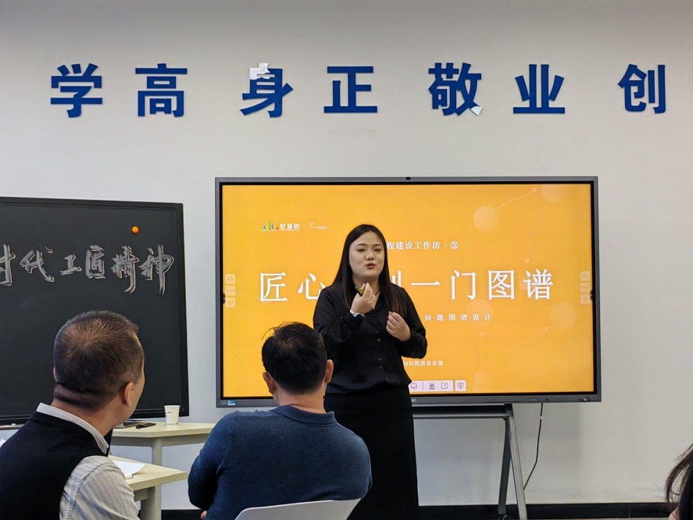 活动中,智慧树产品经理汤丽丽通过丰富的实际案例,深入浅出地介绍了知识图谱的概念、技术架构以及在教育教学中的巨大潜力。参训团队在智慧树金课咨询师韩亚潮、客户经理李金龙、王金平三位小组长带领和悉心指导下,遴选相关课程内容,围绕“精心构筑模块”“匠心绘制一门图谱” “悉心打造一节AI课”三个内容,利用 AI 技术,进行了课程模块设计、知识图谱和问题图谱绘制等实操体验和交流分享。