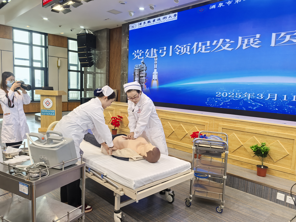 在本次活动中,护理专业教师与酒泉市第二人民医院护士长及各科室骨干护士进行了深入的交流与学习,医学院代表队和市二院代表队分别进行护理急救技能展示。