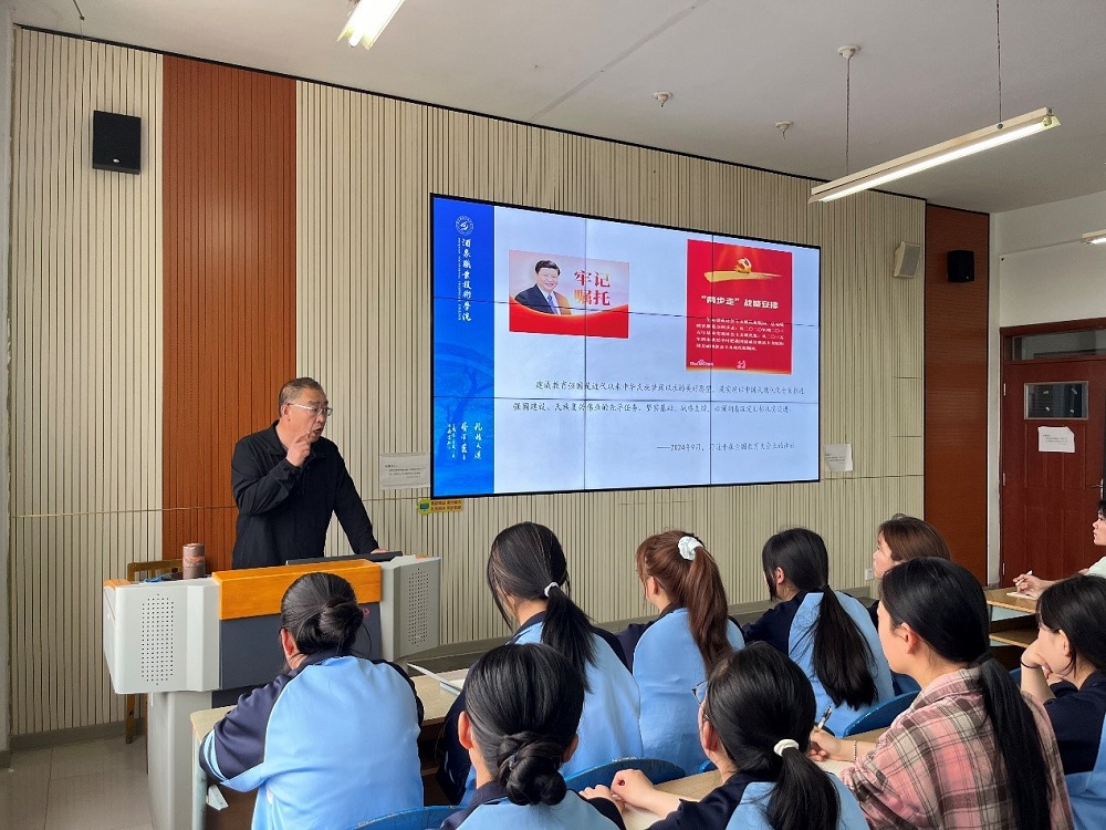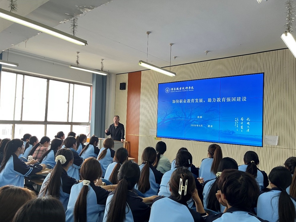 2025年5月14日,酒泉职业技术大学党委副书记、校长许军走进课堂,为2024级酒店管理与数字化运营专业的同学们带来了一堂意义深远的《形势与政策》课程。本次课程以 “加快职业教育发展,助力教育强国建设” 为主题,从回顾与分析、此岸与彼岸、使命与担当三个部分展开,为同学们清晰勾勒出职业教育的发展脉络,明确了大家在教育强国建设征程中的责任与方向。