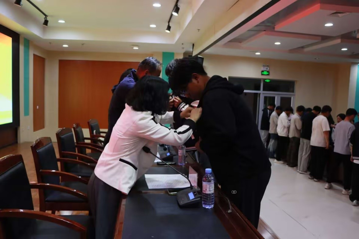 在随后举行的佩戴校徽仪式上,学院领导和与会教师为新生代表郑重佩戴上酒泉职业技术大学校徽。这枚小小的校徽,不仅象征着新生们正式成为酒泉职大的一员,更承载着一份沉甸甸的责任与荣耀,极大地增强了新生的归属感和使命感。