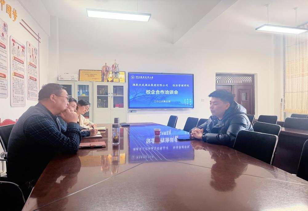 2026 年 3 月 4 日下午,经济管理学院与酒泉汉武酒业集团有限公司校企合作洽谈会在经世楼一楼会议室举行。双方围绕电子商务专业人才培养、电商实训基地共建等核心议题深度交流,达成多项合作共识。经济管理学院党支部书记丁天明,党支部副书记、院长张晓彬,副院长杜静,酒泉汉武酒业集团有限公司侯振涛部长出席会议。