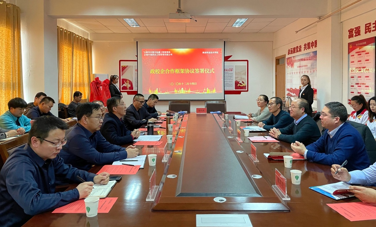 12月14日,白银市兴堡川电灌工程管理局党委书记、甘肃中部供水工程建设管理有限公司董事贾汝锟、副局长张百宇带领党委办公室、人事科、财务科以及机电科等相关部门负责人一行6人来我校考察交流,并与我校签订政校企合作框架协议。学校党委书记、校长易志军,党委委员、副校长王长荣出席签约仪式。