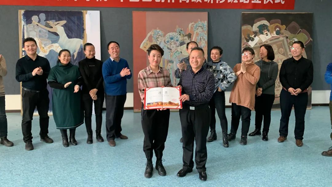 经过为期一个多月的理论、创意、技法的系统讲授和研讨,参加研修的美术教师团队科研水平得到了加强,艺术观念快速趋向艺术创作的前沿阵地。结业典礼上,学校党委委员、副校长王立智讲话指出,高等职业院校是美术的高等教育基地,对中国传统文化的传承和人才的培养具有义不容辞的责任。学校将继续做好校内师生与社会美术人才的交流活动,培养出更多优秀的中国画创作人才,并为他们提供更多的交流平台和机会。随后,王立智宣读聘任文件并向本次高研班指导教师高丽娟颁发客座教授聘任证书。学员们向学校捐赠书画作品后,指导教师高丽娟作结业总结,她肯定了学员们的学习成果,对他们的作品给予了高度的评价,也从学术的高度提出了珍贵的意见。酒泉市文联主席何国宁对学院作品进行了点评。最后,王立智同高丽娟一起向学员颁发结业证书。