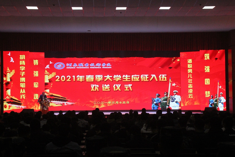 3月15日下午,2021年春季大学生应征入伍欢送仪式在胡杨文化活动中心举行。学校党委委员、纪委书记监察专员魏韡出席欢送仪式并讲话,学生工作部、各二级学院有关领导及师生代表500余人参加欢送仪式。