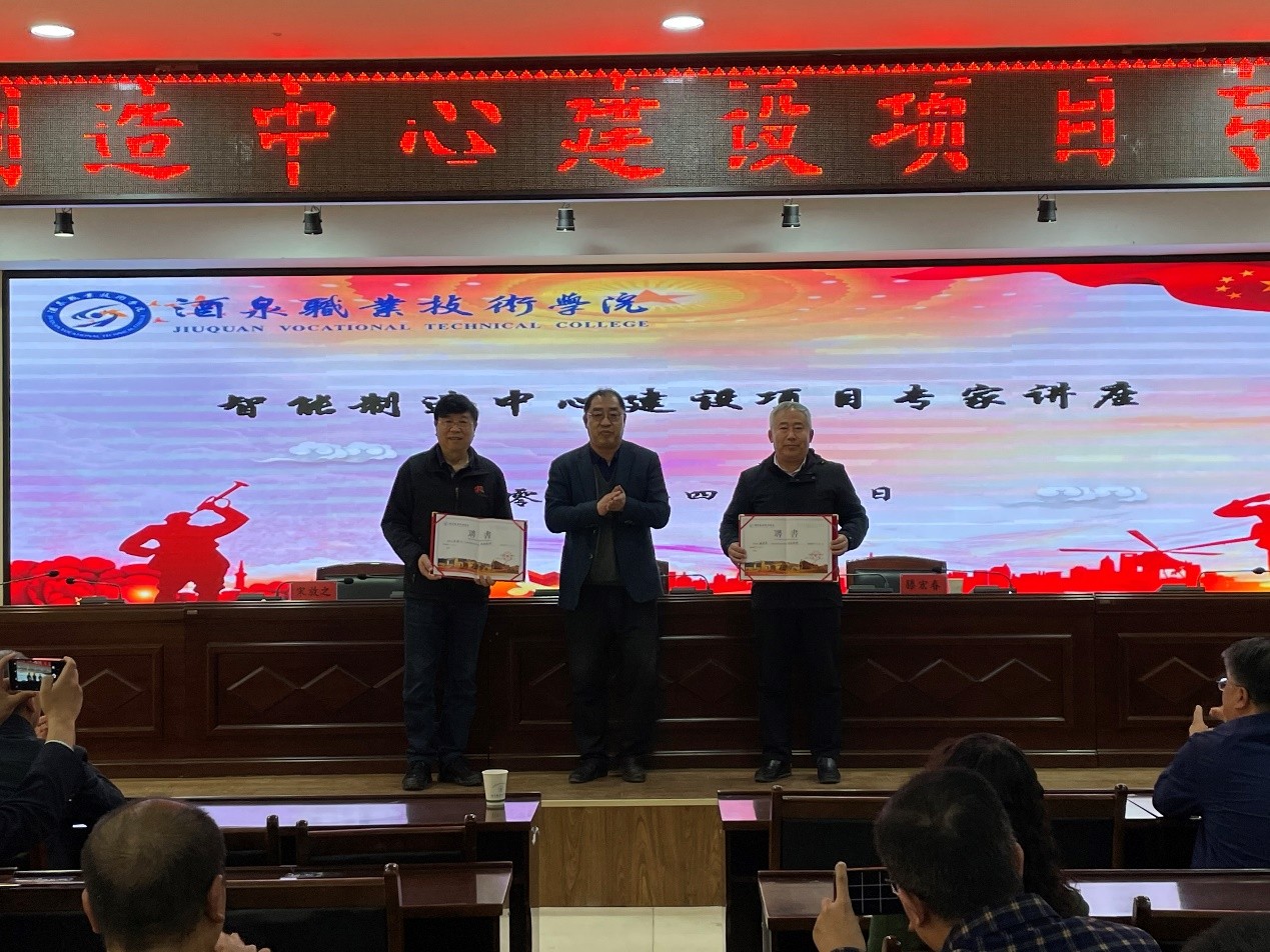 许军副校长致欢迎词,对两位专家的到来表示热烈欢迎,并对智能制造中心建设给予的帮助和指导表示感谢,并代表学校为两位教授颁发了酒泉职业技术学院客座教授聘任证书。