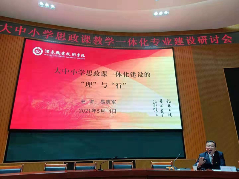 为进一步贯彻落实习近平总书记在学校思想政治理论课教师座谈会上的重要讲话精神和《关于深化新时代学校思想政治理论课改革创新的若干意见》,不断加强思想政治理论课改革创新,推进大中小学思政课一体化建设,5月14日,酒泉市大中小学思政课教学一体化专业建设研讨会在酒泉育才学校和酒泉职业技术学院召开,学校党委书记、校长,酒泉市大中小学思政课一体化建设专家指导组组长易志军教授应邀作主题报告。