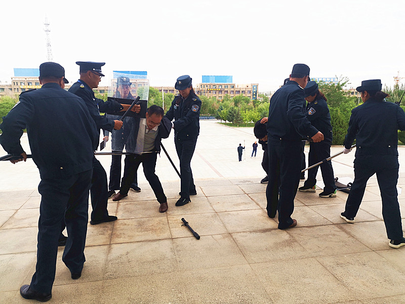 在本次反恐防暴演练中,设置演练情境,应急安稳人员演练遇到持刀“嫌疑人”时迅速反应,并用钢叉死死地叉住嫌疑人的腰部将其控制,持盾牌、短棍的应急安稳员密切配合,以盾牌抵挡嫌疑人,并持短棍做好“防暴”工作。在必要时刻,应急安稳人员可用盾牌护胸,向嫌疑人喷射辣椒水,并迅速将嫌疑人制服。整个演习过程紧张有序,严肃逼真,处置及时,取得了预期效果。