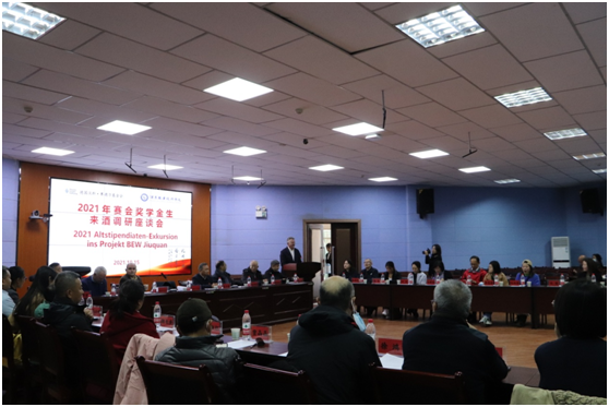 2021年10月15日,德国汉斯·赛德尔基金会北京代表处组织赛会曾资助的38名奖学金生来我校考察调研,我国前驻德大使、现任中德友好协会会长史明德先生同行,学校党委委员、副校长王立智陪同。考察团参观了我校的光伏电厂、飞天书画院和敦煌非遗文化传习所。座谈交流会上,王立智介绍了学校的发展情况以及与赛会的合作情况,德国汉斯·赛德尔基金会甘肃代表处首席代表魏博(Volker Weber)介绍了西部中心的发展目标、工作内容和具体举措。各位与会人员进行了热情洋溢、衷恳深入地交流,为我校更深入地开展国际合作提供了新思路。
