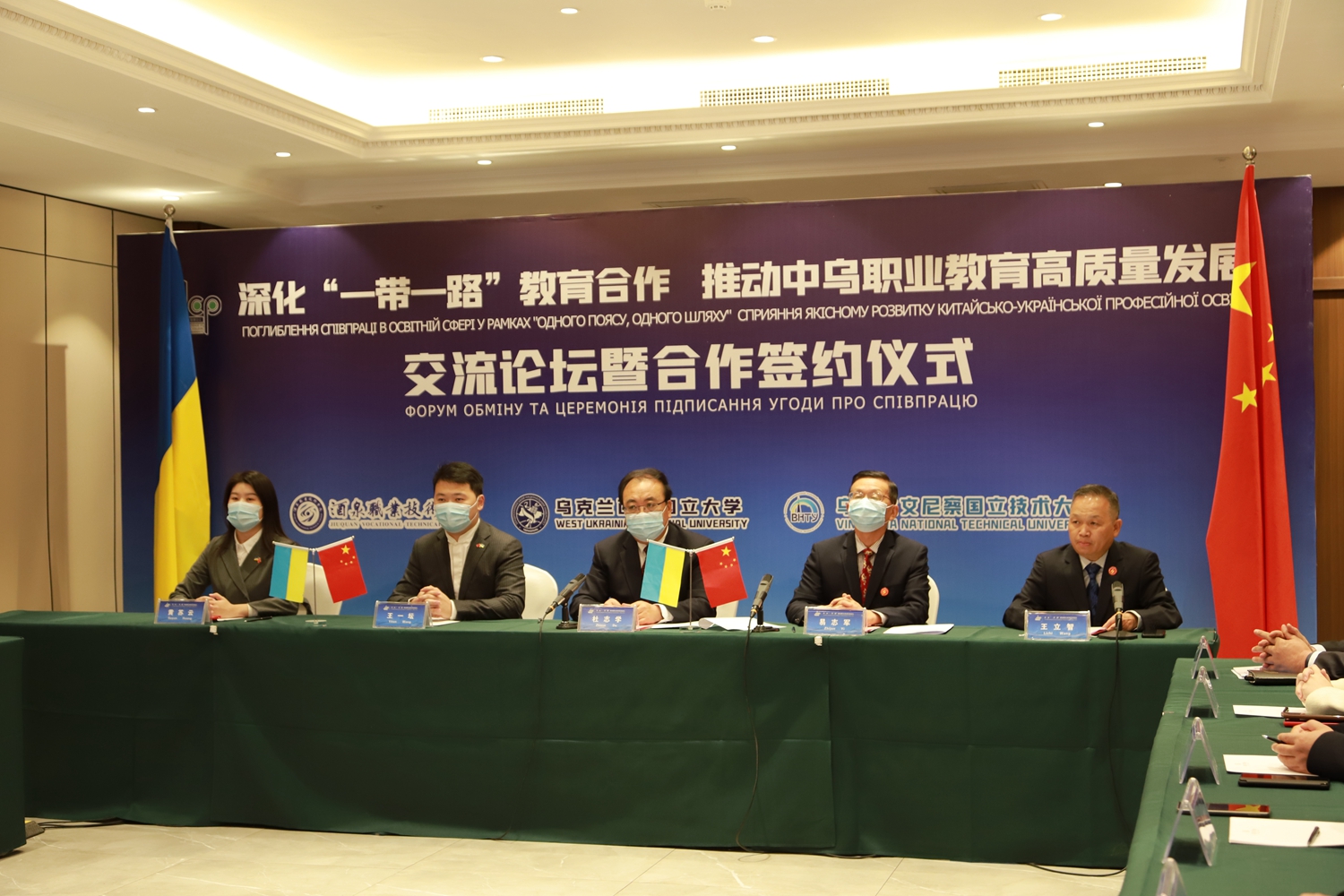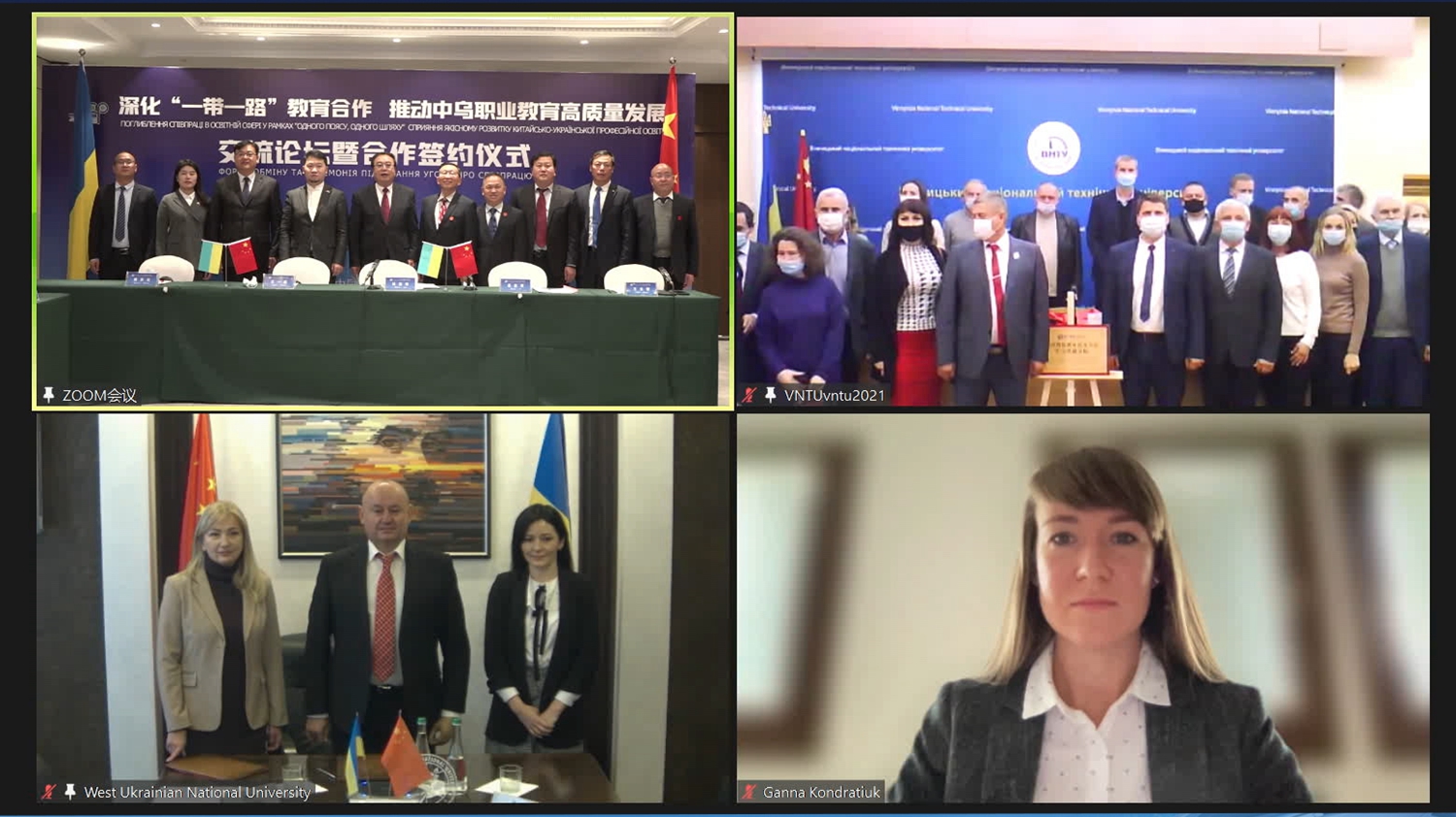 要闻快递 > 正文2021年10月19日,酒泉职业技术学院和乌克兰西部国立大学、乌克兰文尼察国立技术大学职业教育高质量发展交流论坛暨合作签约仪式举行线上会议。中方会场设在酒泉宾馆飞天会议室。出席仪式的乌方人员有乌克兰文尼察第一副州长娜塔莉娅·扎博洛特娜、乌克兰捷尔诺波尔副州长维克托·乌斯坚科、乌克兰文尼察市副市长安德烈·奥切列特尼、乌克兰捷尔诺波尔市议会教育科学部部长奥丽加·波赫利亚科、乌克兰西部国立大学校长安德烈·克里索瓦特、乌克兰文尼察国立技术大学校长维克多·比利琴科等。中方人员有酒泉市政协副主席杜志学、乌克兰文尼察国立技术大学中国事务部管理委员会主席王一坛、乌克兰文尼察国立技术大学中国办事处主任黄苏云、酒泉职业技术学院党委书记、校长易志军,市教育局副局长邹志平、市外事办副主任刘军德等,以及酒泉职业技术学院20名教师代表参加了签约仪式。酒泉职业技术学院党委委员、副校长王立智主持签约仪式。