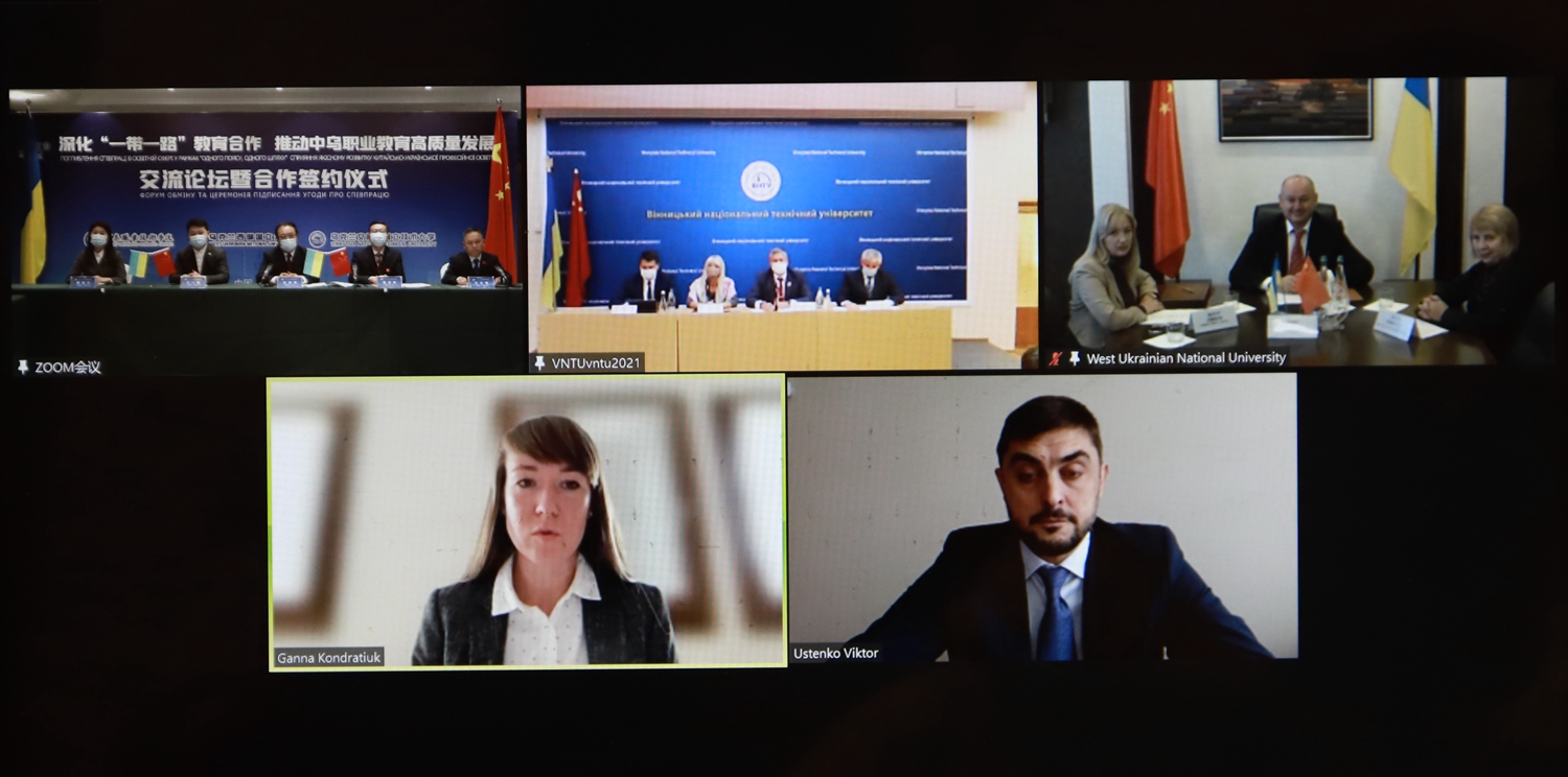 易志军与乌克兰西部国立大学校长安德烈·克里索瓦特、乌克兰文尼察国立技术大学校长维克多·比利琴科分别进行了线上交流洽谈。易志军表示要以本次论坛为契机,加强与乌方学校在职业教育培训、学历提升、留学服务、师资培养等方面的交流合作,共建更加开放合作的教育伙伴关系,共筑更加开放共享的教育交流平台,共推更加开放创新的教育交流合作。