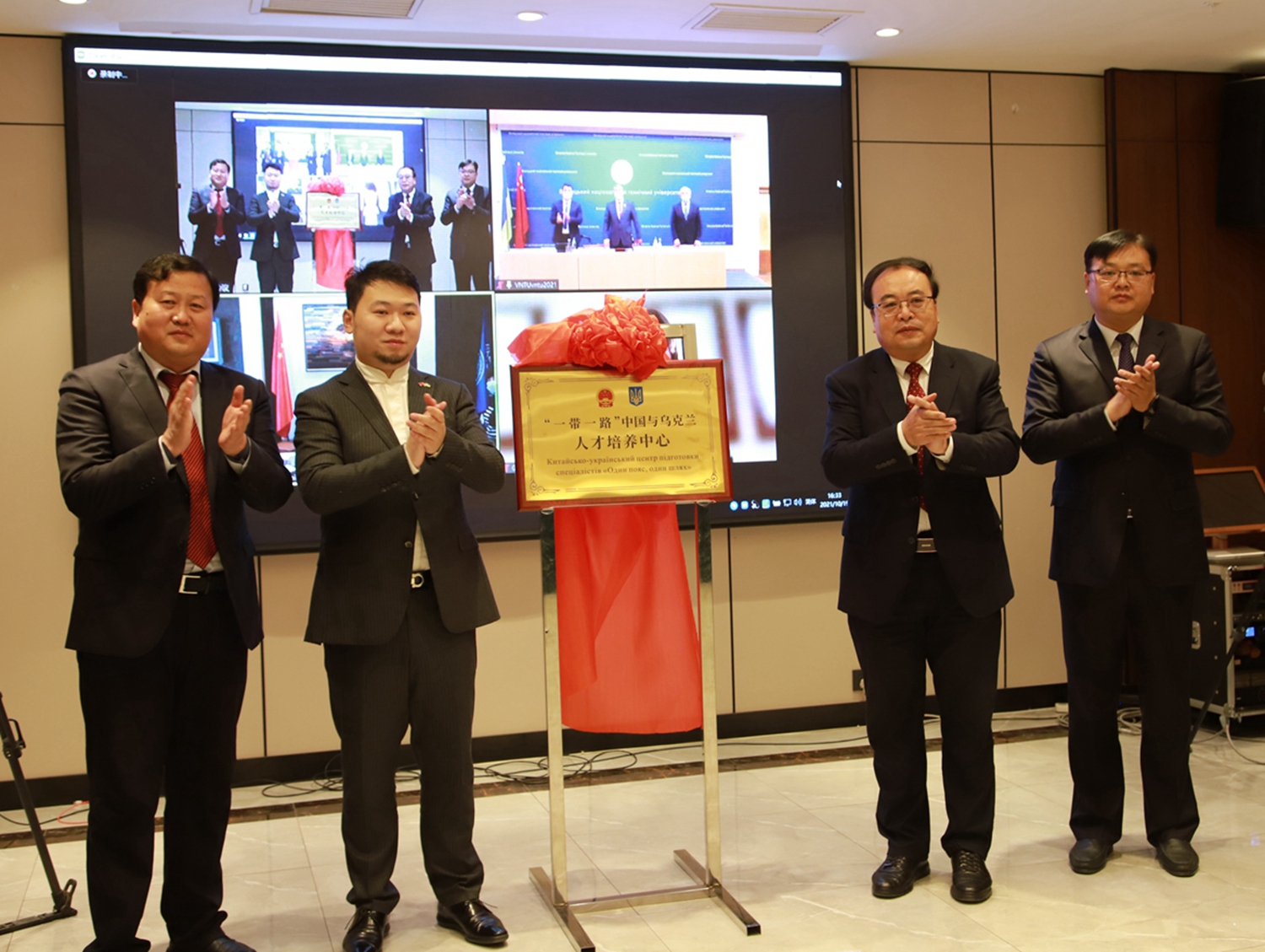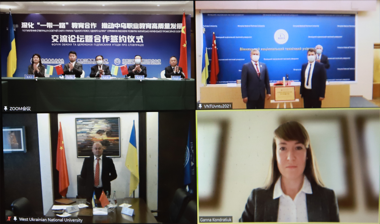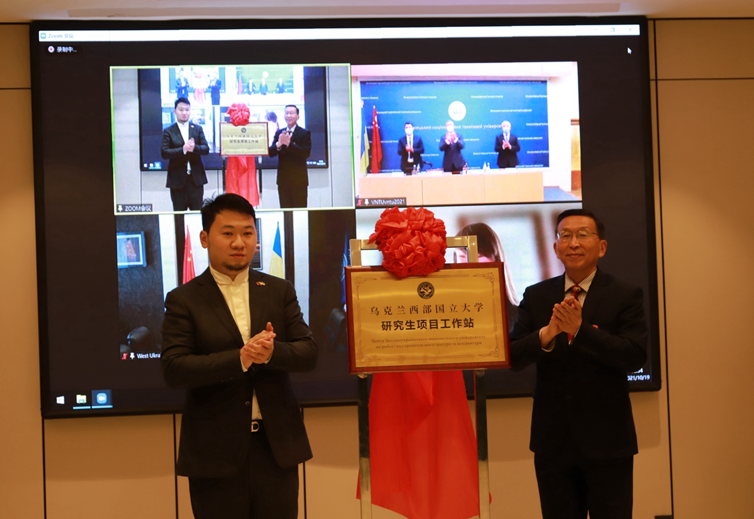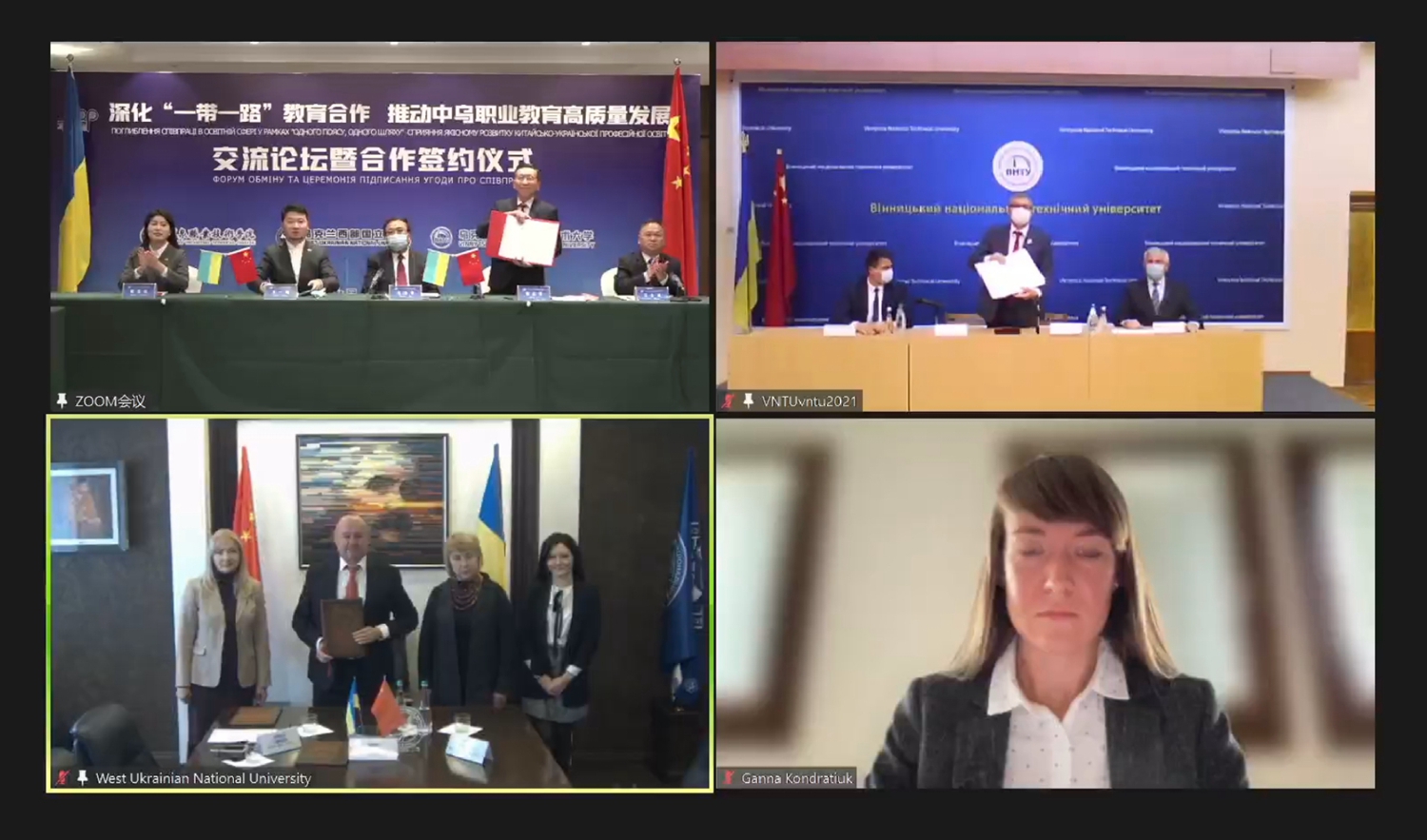 酒泉职业技术学院党委书记、校长易志军代表学校分别与乌克兰西部国立大学、乌克兰文尼察国立技术大学签署了合作协议。中方会场为“一带一路”中国与乌克兰人才培养中心、西部国立大学研究生项目工作站、文尼察国立技术大学研究生项目工作站进行了揭牌。乌方会场为酒泉职业技术学院中乌丝路学院进行了揭牌。