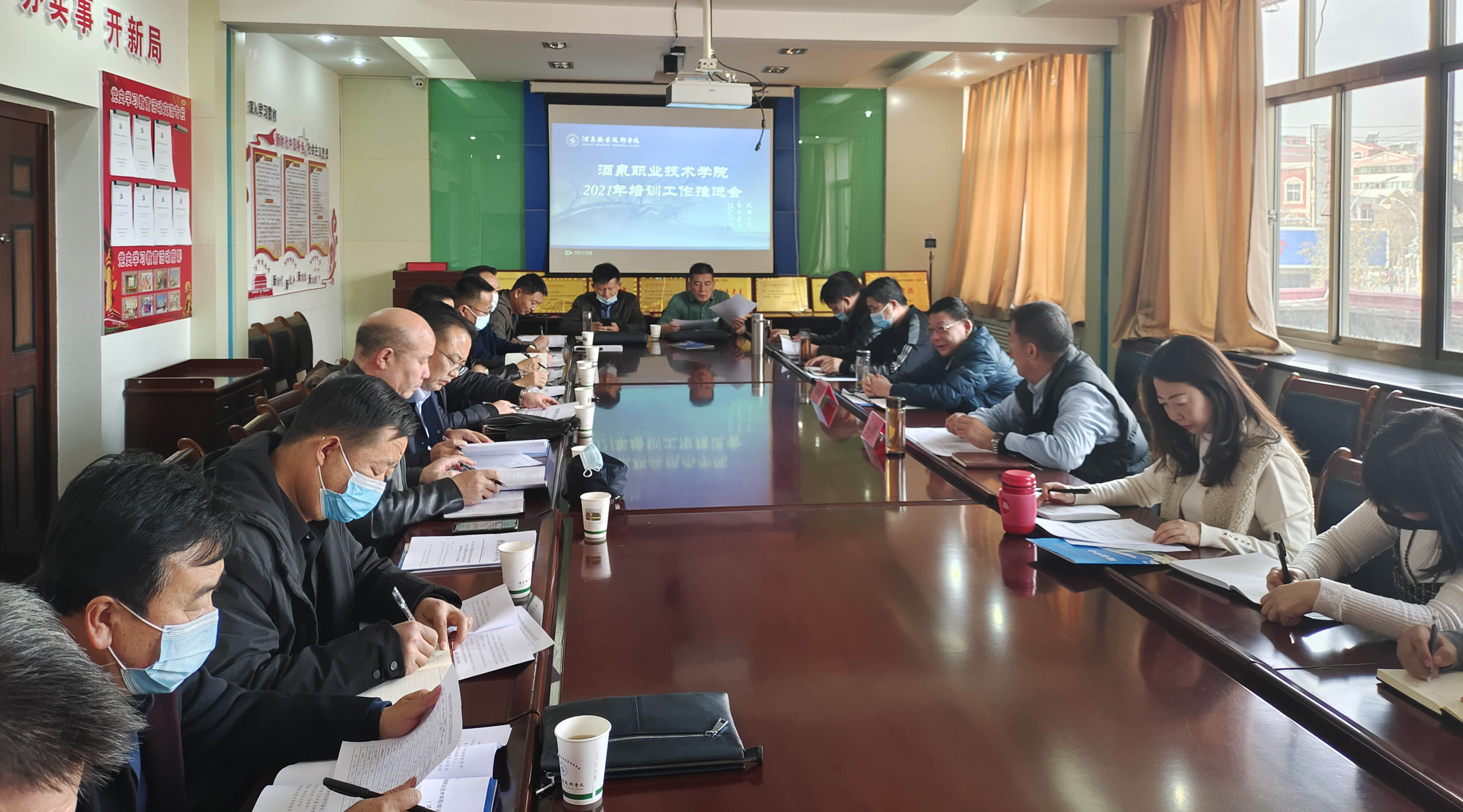 本次会议学习了《酒泉职业技术学院社会培训管理办法》、《酒泉职业技术学院培训工作绩效考核办法》; 各考核单位汇报了目前做的培训项目开展情况,会议针对培训过程中遇到的问题和瓶颈,逐一进行了分析、讨论,提出了解决方案和思路,并对近期工作进行了安排部署,明确了2021年培训任务分解和年底要完成的任务指标。