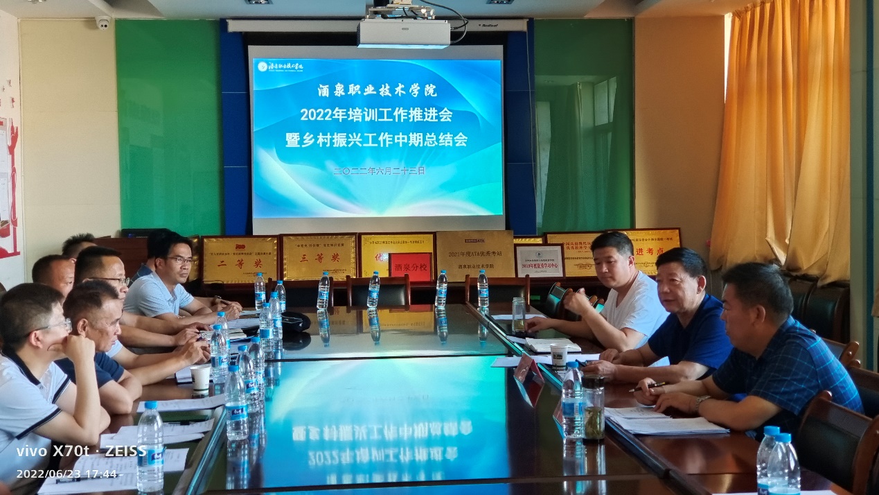 为认真总结2022年上半年全校培训与乡村振兴工作开展情况,进一步提升培训与乡村振兴工作水平,更好的服务我校“双高”建设和“创本”工作。 2022年6月23日下午,在继续教育学院二楼会议室召开了酒泉职业技术学院2022年培训工作推进会议暨乡村振兴工作中期总结会议,党委委员、副校长吴建春出席会议并发表讲话。培训处处长、乡村振兴学院院长张祥主持会议,各二级学院相关负责人、培训处、乡村振兴学院全体教师参加了本次会议。