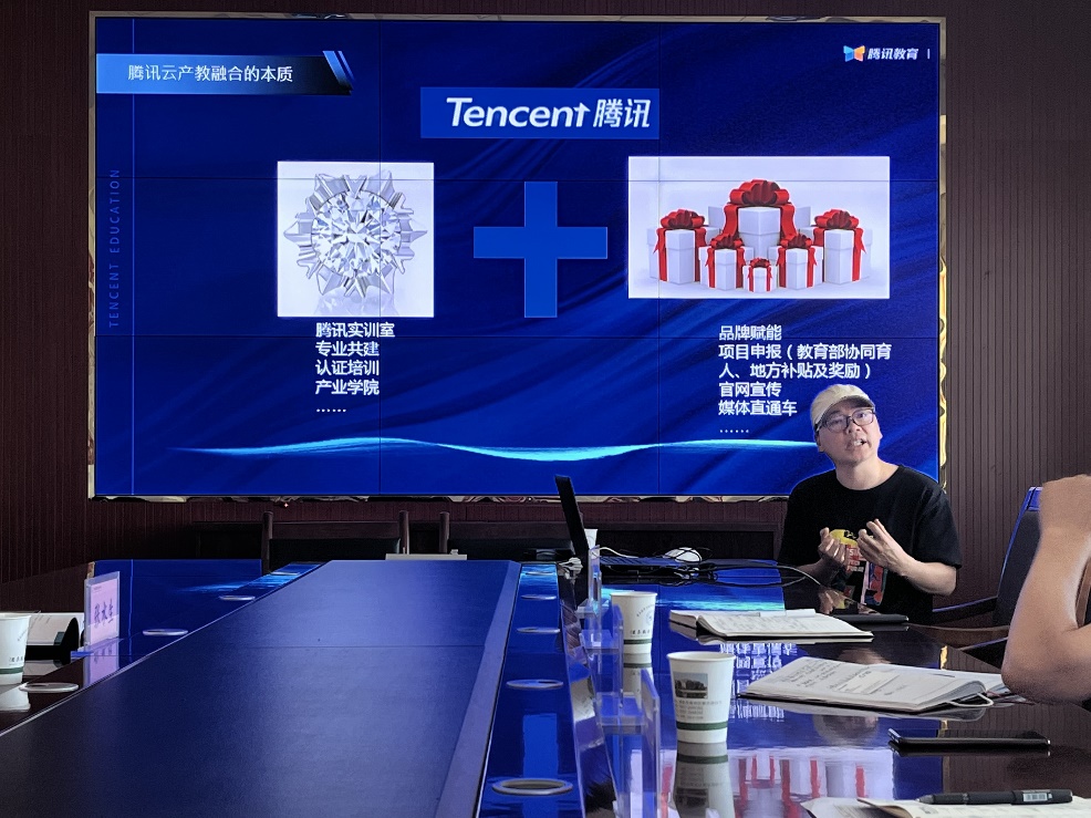 校企合作高级架构师张水生重点讲解了腾讯“互联网+教育”业务。双方在座谈会上对学校产业学院建设、信息化建设、人才培养、1+X证书等方面进行了深度研讨。