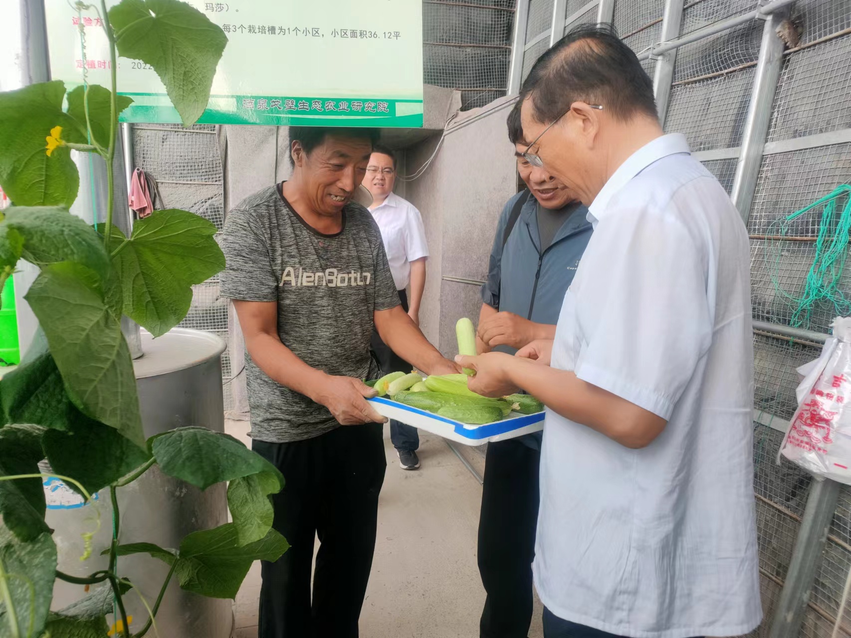 在中以(酒泉)绿色生态产业园,全国十佳农技推广标兵、国务院特殊津贴专家、酒泉市农业技术推广中心副主任、酒泉职业技术学院现代农业技术专业群带头人张国森研究员介绍了目前重点研究并推广的自动化施肥轻简设施栽培技术,全面考察参观了园区整体的大型营养液供液系统、轻简化栽培槽设置、设施太阳能加温保温系统、单行密植番茄等蔬菜无土栽培现场。