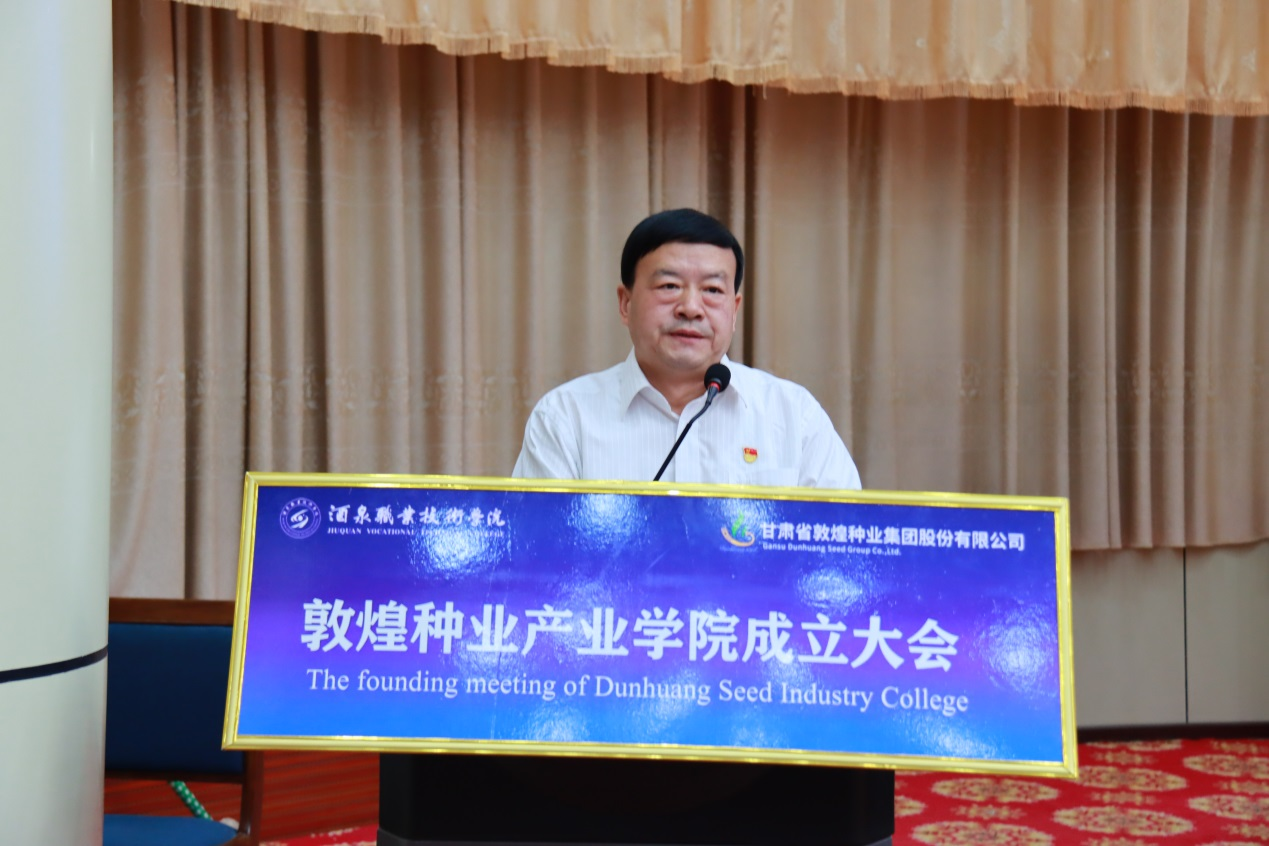 易志军在成立大会上发表了热情洋溢的致辞。他指出敦煌种业产业学院的成立,既是深化职业教育内涵建设,促进教育与产业契合发展的重要探索,也是提升职业教育服务产业发展能力的最佳体现。他希望产业学院要发挥企业在高素质技术技能人才培养中的主体作用,校企协同全力推动企业资源在人才培养中的深度融合,全面探索建立人才培养“共育、共建、共管”的产教融合、协同育人新机制。