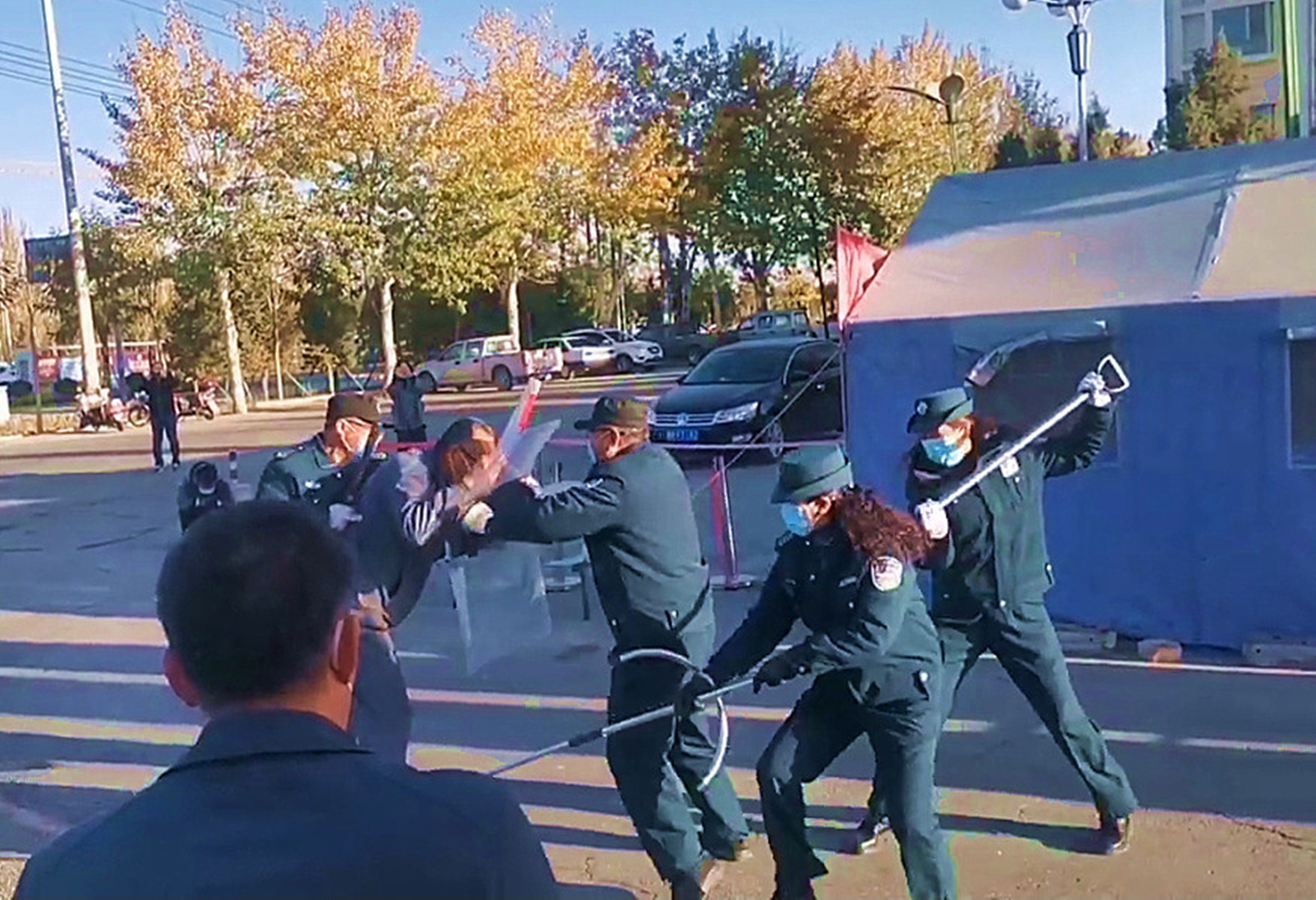 演练活动中,一名“持械歹徒”手持凶器意图砍杀外出学生并要闯进校园,安保人员迅速反应,大声呵斥、让其离开,“持械歹徒”不听劝告,挥舞着手中的凶器要硬闯学校大门,同时,其他当班人员听到呼叫,马上就位,临危不乱与歹徒交涉周旋,安保人员手持钢叉、盾牌、抓捕器、警棍等警械上前与之进行对抗,最终将“歹徒”制服。整个演练过程分工明确,井然有序,达到了预期的效果。