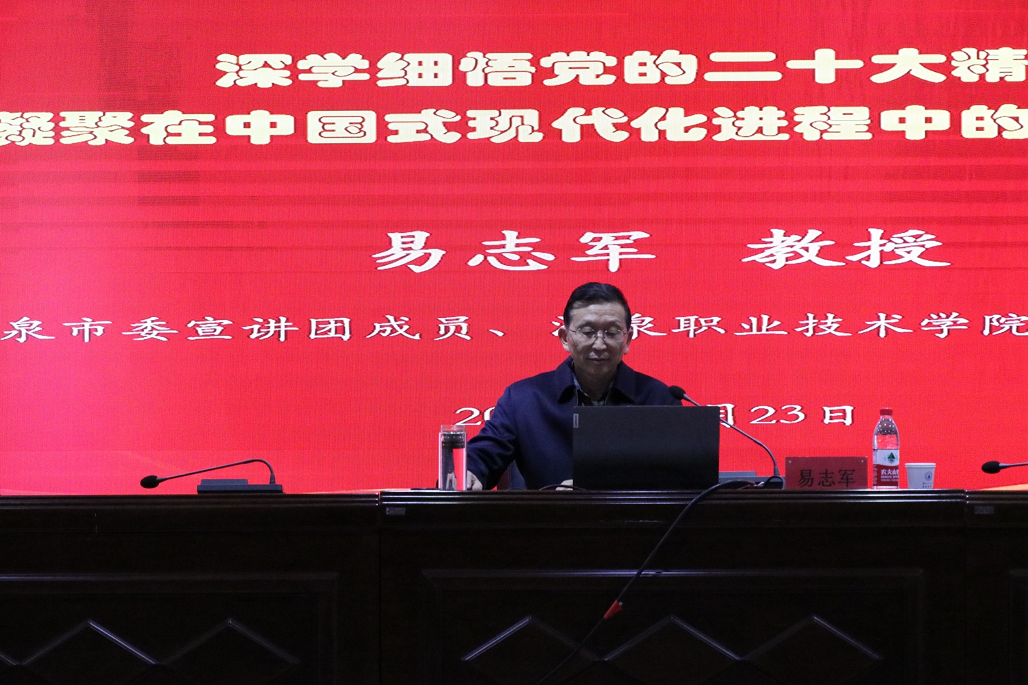 易志军书记围绕“中国式现代化的鲜明特征”“中国式现代化的本质要求”“唯物史观视域中的中国式现代化”“中国价值视域中的中国式现代化”“推进中国式现代化的基本原则”等方面,紧密联系学校实际,坚持理论与实践、历史与现实相结合,用大量数据和详实事例,对党的二十大精神的核心要义进行了深入浅出的宣讲和阐释。