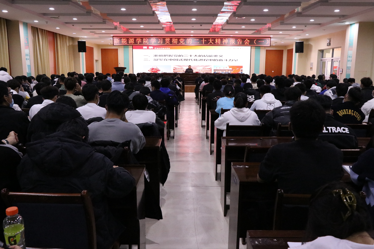 为深入学习宣传贯彻党的二十大精神,吃透精神实质,把握核心要义,激励师生踔厉奋发、勇毅前行。2022年11月23日晚,邀请学校党委书记、校长易志军在图书馆4楼会议室做《深学细悟党的二十大精神——凝聚在中国式现代化进程中的奋斗力量》为主题的党的二十大精神宣讲。本科教学部全体在校教师和兰州理工大学新能源学院师生近400人参加本次宣讲大会。