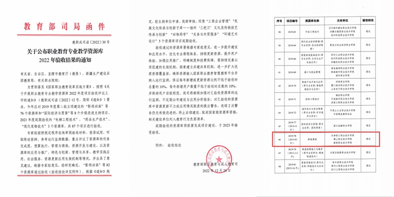 近日,教育部发布《关于公布职业教育专业教学资源库2022年验收结果的通知》(教职成司函〔2022〕30号),由我校与天津轻工职业技术学院、佛山职业技术学院共同牵头主持的新能源类专业国家教学资源库升级改进项目顺利通过验收。