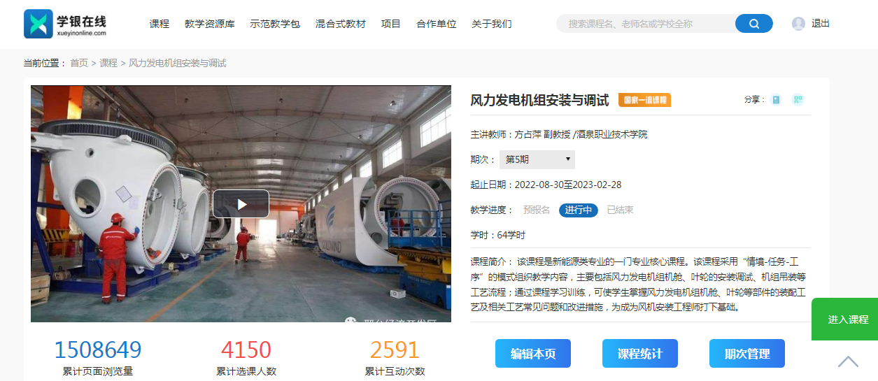《风力发电机组安装与调试》是风力发电工程技术、新能源装备技术等专业的核心课程,对接“风电机组安装与调试”生产岗位,培育学生具备“知识+技能+思政”的综合职业能力,截至目前,该课程页面累计浏览量超过150万次,累计互动超过2000次,在全国院校、企业职工广泛使用。通过课程建设与应用,有力的推进了专业与产业、生产过程与教学过程等方面的有效对接,下一步将以此获批职业教育国家在线精品课程为契机,深度整合教育教学资源,全面推进教学改革,提高人才培养质量,为社会培养更优质的高素质高技能复合型人才,全面提高学校的办学水平。(信息员:新能源工程学院 柳国琦)