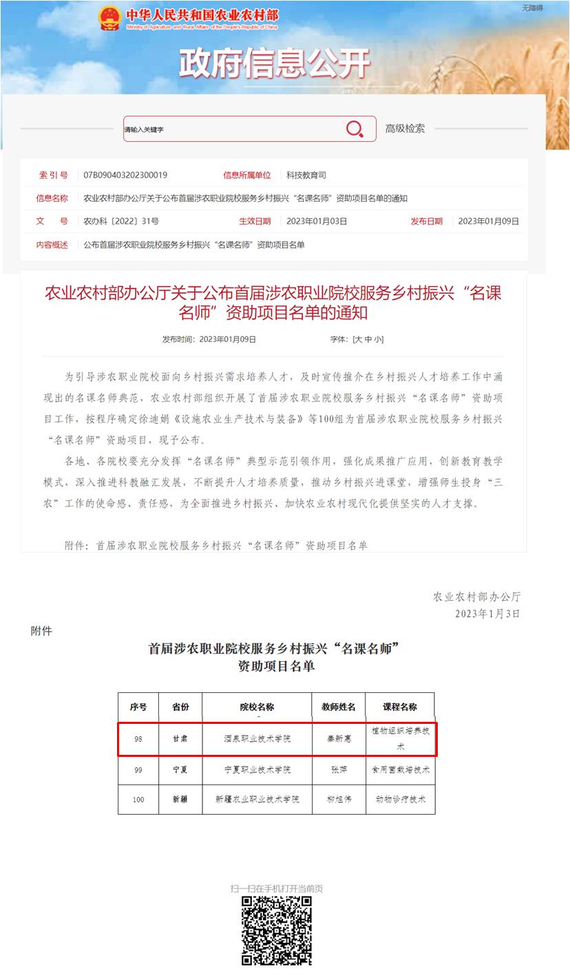 近日,农业农村部办公厅下发了《关于公布首届涉农职业院校服务乡村振兴“名课名师”资助项目名单的通知》,全国共有100组课程获评首届涉农职业院校服务乡村振兴“名课名师”资助项目。我校生物工程学院秦新惠教授负责的《植物组织培养技术》课程经学校推荐、甘肃省农业农村厅评选,成功入选农业农村部首届涉农职业院校服务乡村振兴“名课名师”资助项目,这是甘肃高校唯一入选的一组课程,也是我校服务乡村振兴人才培养工作的重要突破。