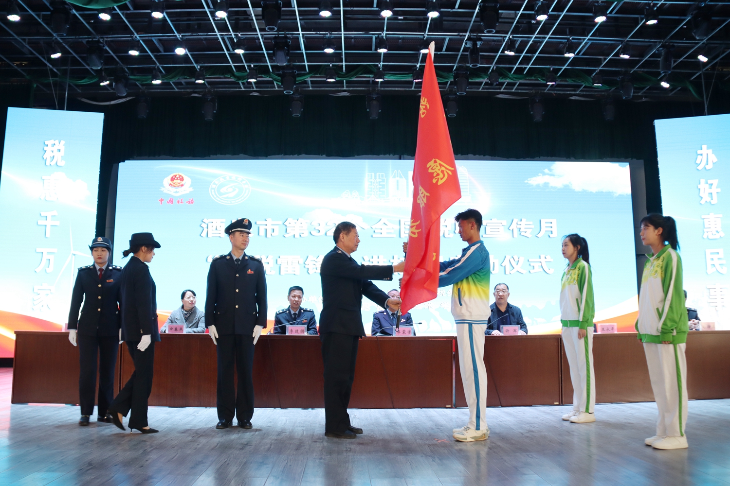 酒泉市税务局向学校捐赠图书,并向大学生税法宣传志愿服务队授旗。