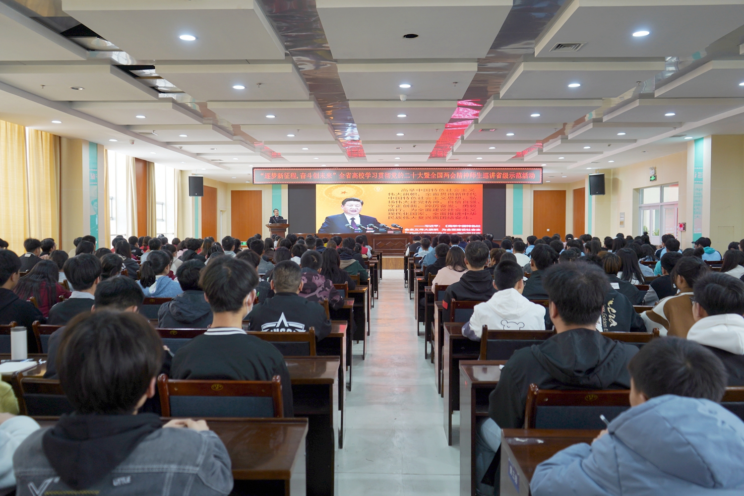 要闻快递 > 正文根据省委宣传部和教育部思政司关于开展学习宣传贯彻党的二十大精神和全国两会精神基层宣讲、师生巡讲活动的部署要求,4月21日,全省高校学习贯彻党的二十大暨全国两会精神第五巡讲团来我校宣讲。巡讲团成员由甘肃省学习贯彻党的二十大精神专家宣讲团成员、兰州交通大学马克思主义学院苏星鸿教授,兰州交通大学辅导员、思政课教师、国家二级心理咨询师林安秀及兰州交通大学黄子超同学组成。学校党委书记、校长易志军主持报告会。党委委员、副校长王立智、王长荣出席报告会。