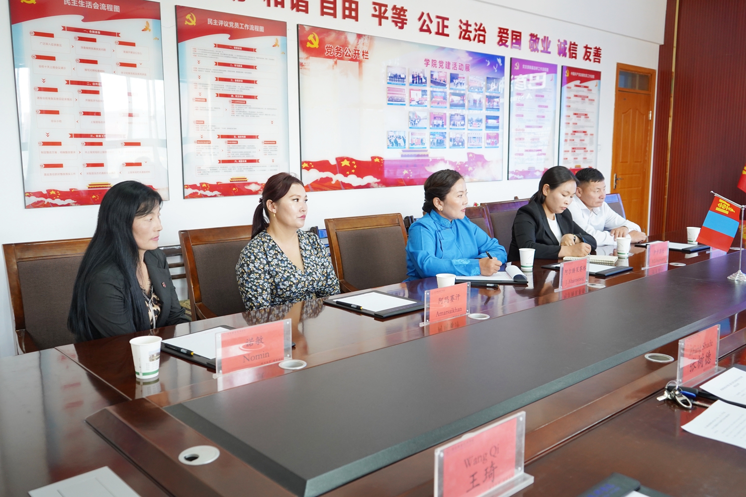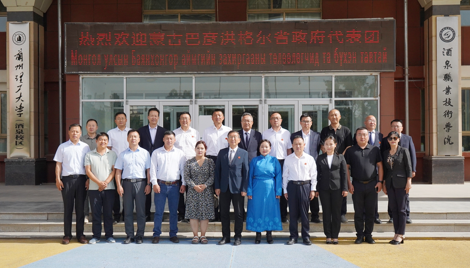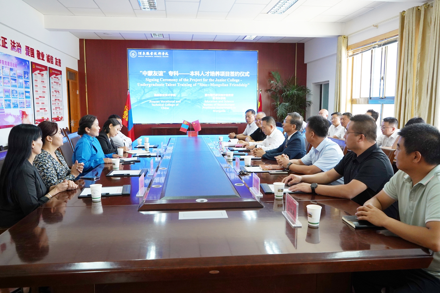 座谈后,双方代表还签署了《“中蒙友谊”专科-本科人才培养项目协议》,并互赠礼品。会后,与会人员合影留念。