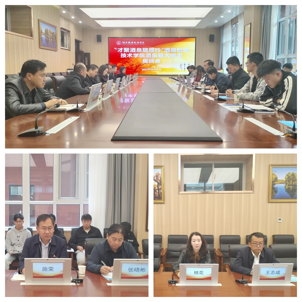 座谈会上,学校党委委员、副校长施荣代表学校致欢迎辞,并介绍了我校发展概况、专业设置、人才培养、实习就业、“双高”建设及创建职业技术大学等相关情况。酒泉市人才中心副主任桃花对学校一直以来为酒泉市社会、经济发展所做的巨大贡献表示衷心的感谢,并向与会师生介绍了酒泉市社会经济发展和人才需求情况;酒泉市人力资源和社会保障局四级调研员王志成就酒泉市毕业生就业创业十条政策进行了详细解读,并认真解答了学生的相关提问。座谈会现场气氛热烈,酒泉籍生源学生纷纷表达了毕业后回乡就业创业的意愿。酒泉市人社局还选聘我校4名优秀学生作为酒泉市“招才引智联络员”并颁发聘书。座谈会由党委委员、副校长施荣主持,酒泉市人力资源和社会保障局、酒泉市人才中心、酒泉市各县(区)人才中心和我校招生就业处领导及20多名酒泉籍学生代表参加。