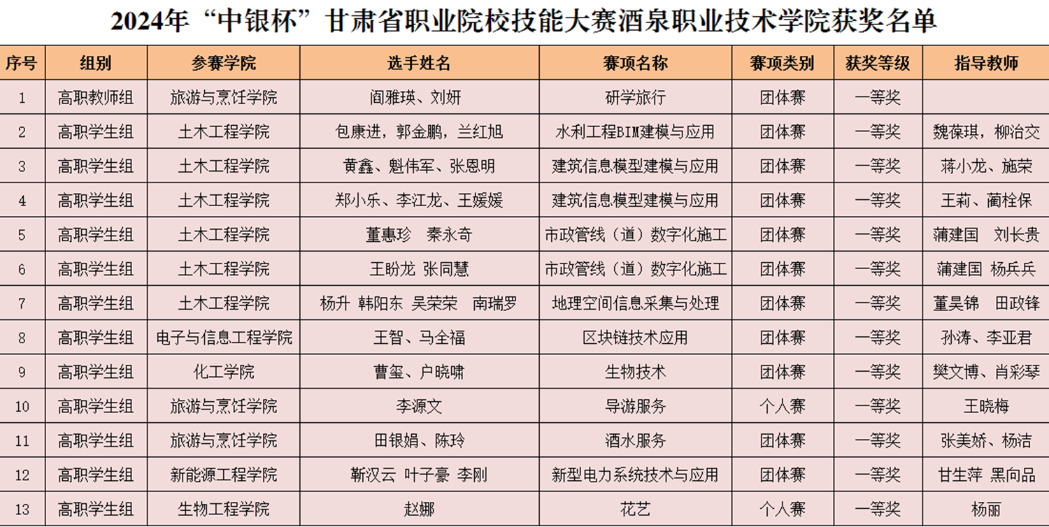 要闻快递 > 正文2024年“中银杯”甘肃省职业院校技能大赛于1月20日圆满落幕。本届大赛共有全省29所高职院校、1所技师学院、119所中等职业学校、23所技工学校的7992名学生、1334名教师,在全省24个赛点17个大类165个赛项中进行技能比拼。我校共派出199名学生、32名教师参加51个赛项的比赛,经过紧张激烈的角逐,共获得一等奖13项,二等奖20项,三等奖32项的优异成绩。其中化工生产技术、生物技术、智能焊接技术、酒水服务、研学旅行、水利工程BIM建模与应用、市政管线(道)数字化施工、地理空间采集与处理、建筑信息模型建模于应用与新型电力系统技术与应用等10个赛项拟获得2024年全国职业院校技能大赛的参赛资格。