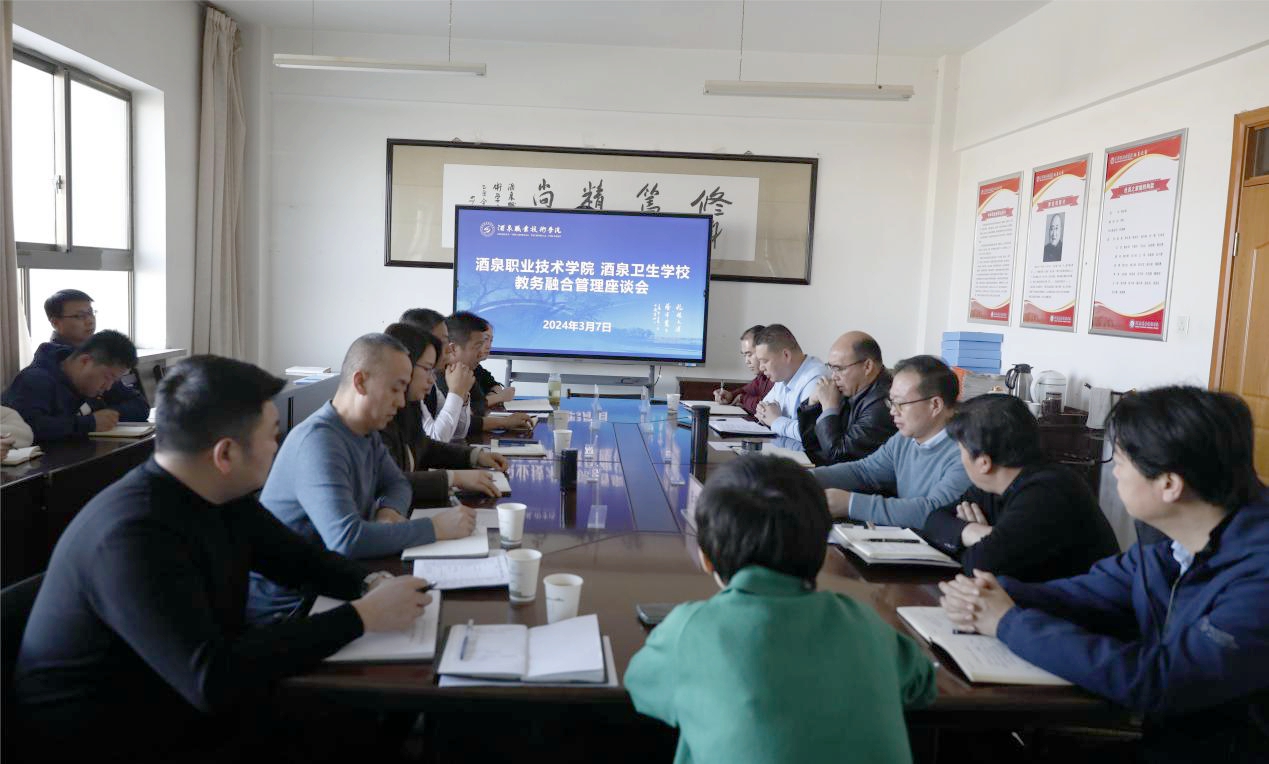 要闻快递 > 正文2024年3月8日下午,在学校行知楼三楼会议室召开了酒泉职业技术学院、酒泉卫生学校教务融合管理座谈会。酒泉职业技术学院教务处处长杨洁、教务处副处长陈学红、招生就业处副处长张晓彬、教师发展中心副主任赵大勇、医学院副院长于荣哉与酒泉卫生学校党委委员、副校长孙俊峰、教务科科长王志锐及两校教务工作人员参加座谈会。座谈会由酒泉职业技术学院教务处副处长王军主持。