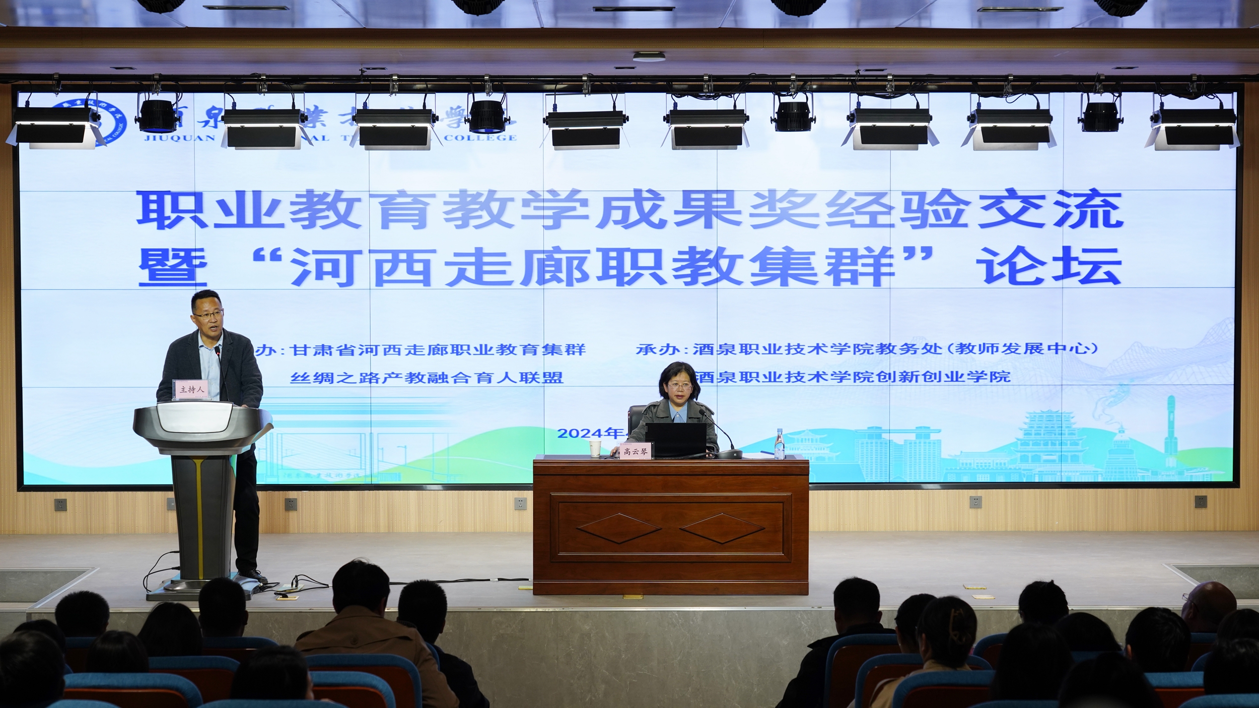 此次论坛由创新创业学院院长倪兴军教授主持,教务处(教师发展中心)和创新创业学院联合承办。参加论坛的嘉宾有酒泉工贸中等专业学校、敦煌艺术旅游中等专业学校、酒泉卫生学校、金塔汽修中等专业学校、酒泉职业技术学院各二级学院负责人及主管教学副院长,甘肃省河西走廊职业教育集群酒泉地区各职业学校代表及教学成果奖培育的团队成员。